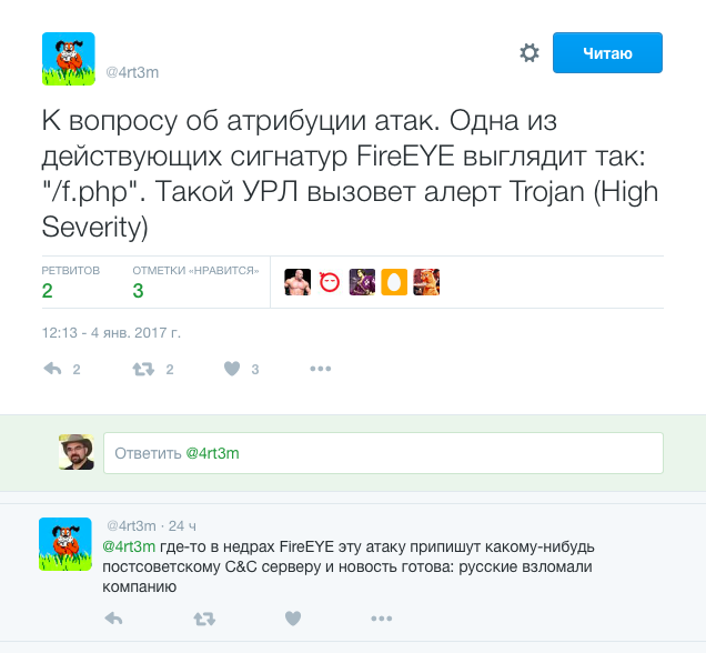 Американские специалисты и не заморачивались особо. Кстати, у той же FireEye (а Mandiant, известная своими исследованиями "русских хакеров", была куплена FireEye три года назад) в качестве одной из сигнатур атак используется вот такая последовательность:
