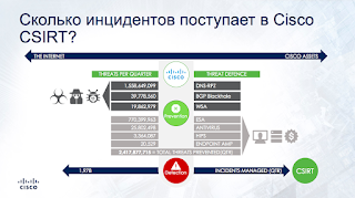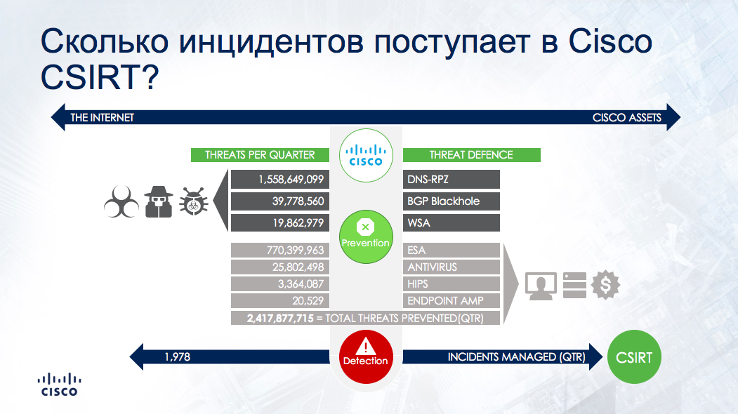 - Внутренняя служба реагирования на инциденты в Cisco обрабатывает около 2000 инцидентов в квартал. При этом угроз мы видим около 2.5 миллиардов, а число событий безопасности и вовсе измеряется десятками триллионов.
