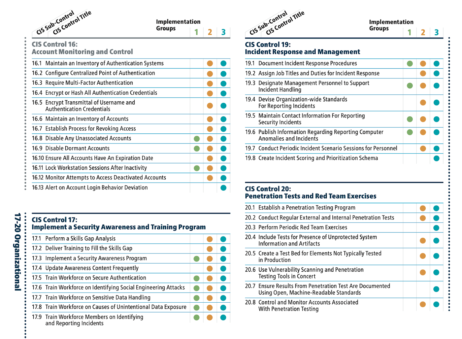В CIS 20 все защитные меры также сгруппированы в так называемые группы внедрения (Implementation Group), которые направлены на компании с разными ресурсами, разной экспертизой в ИБ, разной зрелоостью и моделями угроз. Таких груп три и они каждая из них содержит свой перечень защитных мер по нарастающей.