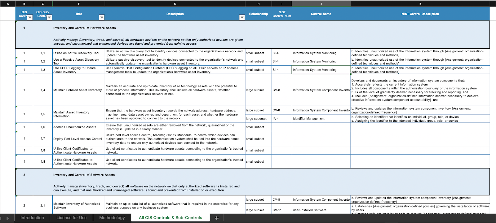 Что делает в таком случае большинство людей? Копипастит все в табличку Excel и начинает с ней работать за счет возможностей, предоставляемых Excel для работы с данными. Например, можно отмечать нужные мне защитные меры (добавляя их или удаляя) и затем делать выборку только по актуальным мерам защиты. Можно, если воспользоваться рекомендациями из вторничной заметки, делать выборку по приоритезированным группам защитных мер. С помощью цветовой маркировки можно отмечать реализованные защитные меры, нереализованные, и находящиеся в процессе реализации. Вот, например, как выглядит такая таблица у Center of Internet Security (CIS). Помимо PDF с описанием защитных мер, они выкладывают еще и таблицу, с которой удобно работать.