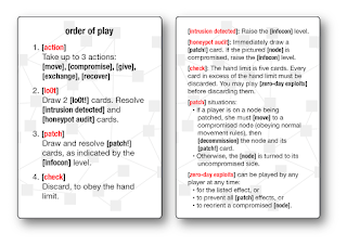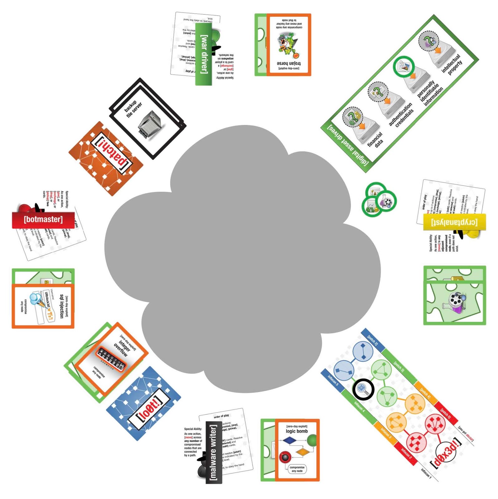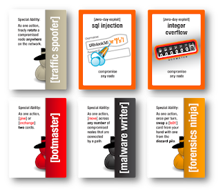 CERT компании Michelin в 2017-м году разработал свою версию карточной игры (на английском и французском языках), исходники которой можно скачать с Github и использовать по своему усмотрению. 42 карты с отличным дизайном поделены на 2 категории - защитники (зеленые) и нападающие (красные). При этом в каждой из категорий есть акторы (фиг знает, как это перевести нормально на русский язык, - термин уже активно используется дипломатами), то есть человеческие персонажи (государственные хакеры, аналитик ИБ, архитектор ИБ, Grey Hat, менеджер проектов, киберпреступники и т.п.), и инструменты (системы обнаружения атак, защита Wi-Fi, Zero Day, DoS, флешка на парковке и т.п.). Каждый персонаж имеет три характеристики - уровень знаний, уровень эффективности и уровень обнаружения. Инструменты могут модифицировать характеристики персонажей в сторону их усиления или ослабления. Сама игра достаточно проста - сдаются карты и затем идет подсчет значений имеющихся на руках характеристик. Интересная задумка и прекрасный дизайн, но не до конца проработанная логика игры, в которой слишком много уделяется удаче.