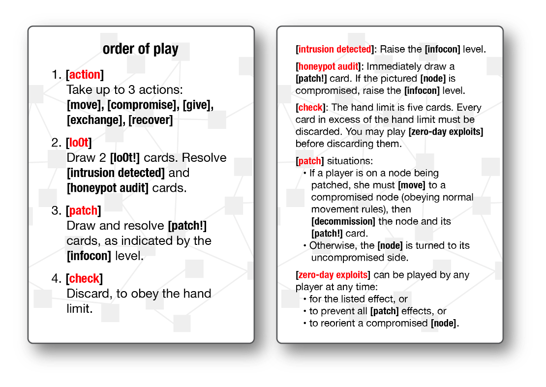 Последняя в этом обзоре игра называется Backdoors & Breaches. Она разработана для проведения штабных киберучений, темой которых является реагирование на инциденты и изучение TTP злоумышленников. 52 уникальных карты, доступные для скачивания шаблоны кар, достаточно простые правила, которые во-многом повторяют то, что я провожу в рамках своих киберучений на тех или иных мероприятий. У их карточного варианта есть как свои плюсы, так и минусы. Плюс связан с формой представления учений - в карты можно играть даже в купе поезда. Минус - вы ограничены теми TTP, которые записаны на картах. В остальном же очень интересный вариант карточной игры по ИБ.