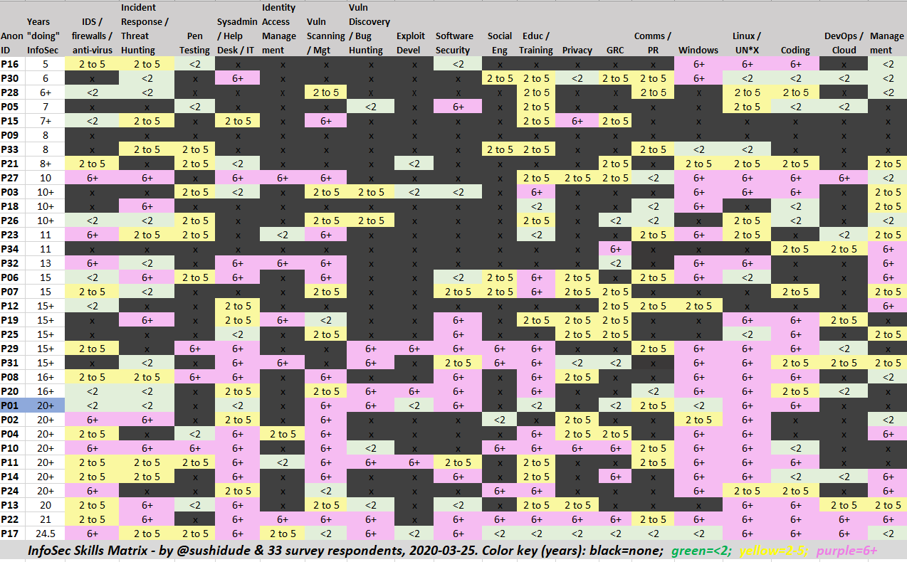 Наткнулся я на днях на вот такую матрицу, которая показывает результаты анонимного опроса 34-х специалистов по ИБ с минимум 5-тилетним стажем по 19 различным навыкам, которыми они обладают или не обладают. Черным показаны пробелы в навыках. Если посмотреть внимательно, то окажется, что только один чувак с опытом более 24 лет обладает всеми навыками. У остальных есть пробелы, местами достаточно значительные. Отсюда можно сделать два простых вывода: