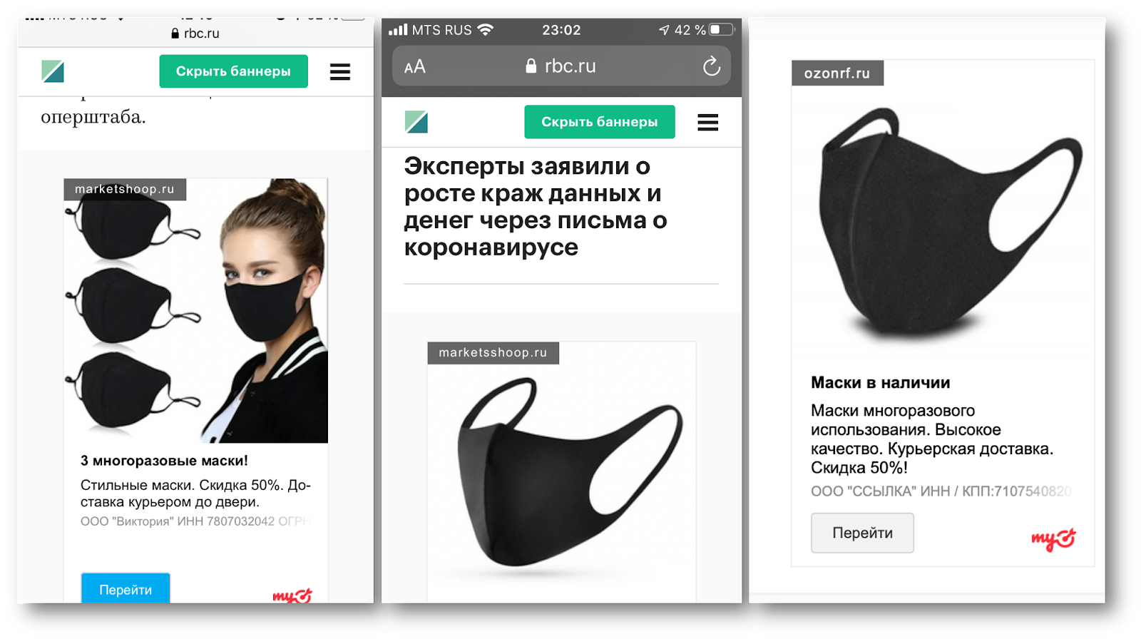 На Хабре я уже писал о том, как мошенники Рунета отреагировали на коронавирус. Сейчас я бы хотел рассмотреть эту историю, но уже с другими примерами, немного с другой точки зрения. Иногда просматривая новости на различных солидных ресурсах, натыкаешься на рекламу, которую обычно пропускаешь уже на автомате. Но в этот раз глаз уцепился за два рекламных объявления, которые я увидел на мобильной версии сайта РБК (левых две картинки). Если приглядеться, то мы увидим, что они ведут на схожие по названию сайты - marketsshoop[.]ru и marketshoop[.]ru. Третья картинка - это реклама уже в стационарной версии какого-то популярного сайта. Эта ссылка ведет на ozonrf[.]ru (сразу скажу, что никакого отношения к Интернет-магазину "Озон" этот домен не имеет).