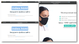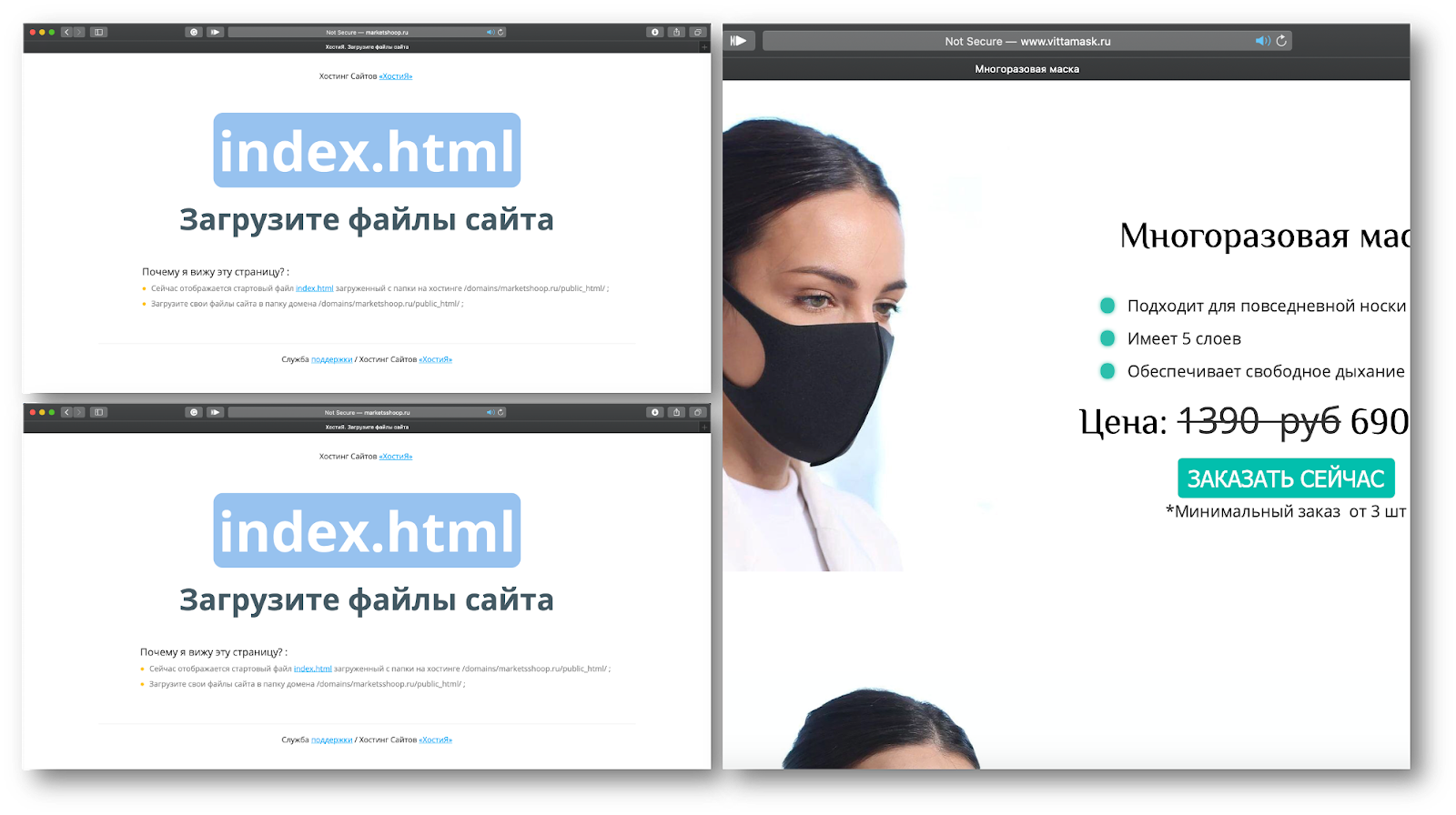 Зайдя из песочницы на эти сайты, видишь, как правило, заглушку. То есть домен создан, он приземлен на хостинг, но наполнения никакого нет. За исключением одного сайта, который действительно "торгует" масками. При этом, что странно, сами домены уже активно рекламируются, а вот ведущие с рекламы сайты не работают.