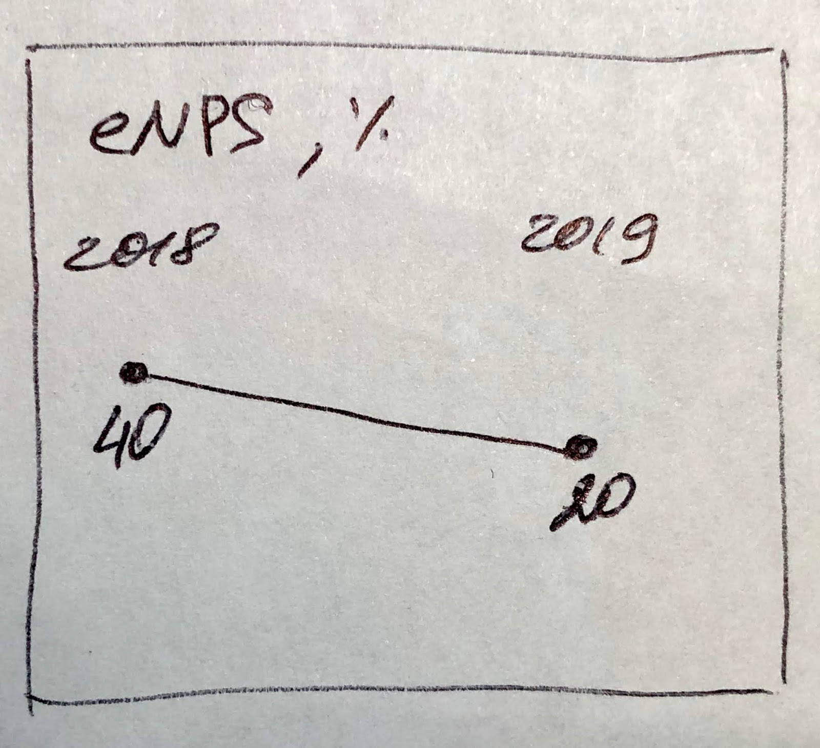 Гораздо более интересен, но очень редко когда он оценивается, показатель eNPS или Employee Net Promoter Score. Первоначально этот показатель (без приставки "e") использовался для измерения лояльности клиентов, но потом возникла идея применить его и к оценке лояльности сотрудников. Он оценивает, насколько сотрудник захочет порекомендовать работодателя своим друзьям и коллегам. Вовлеченность он не оценивает, но общее положение дел помогает увидеть. За этим показателем, на самом деле, скрывается многое. Лояльные сотрудники работают лучше. Они реже увольняются, что приводит к экономии (удержать сотрудника обычно дешевле в 4 раза, чем найти нового). Они выходят с инициативами по улучшению компании. Я не буду подробно расписывать, как считать eNPS (это несложно), но на дашборде у нас будет примерно такая картина. Она говорит нам о том, что лояльность снижается. Это плохой знак и с ним надо будет что-то делать.