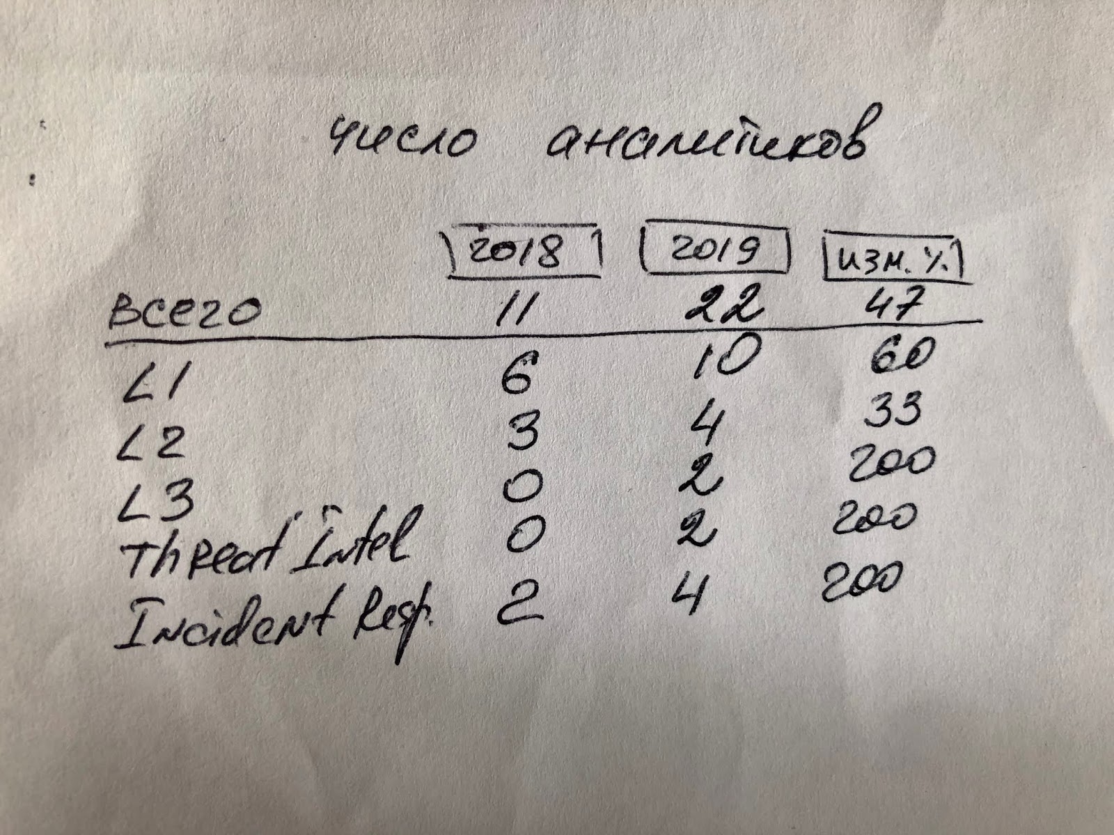 Дальше я пробую продумать варианты визуализации интересующих меня показателей. С точки зрения штатной численности SOC все достаточно просто - главное видеть не статические цифры, а их изменение по сравнению с прошлым годом. Если SOC новый, то % изменений у нас может достигать трехзначных цифр, которых не стоит пугаться. У устоявшегося SOC картинка будет уже более привычной и никаких сотен процентов уже не будет.