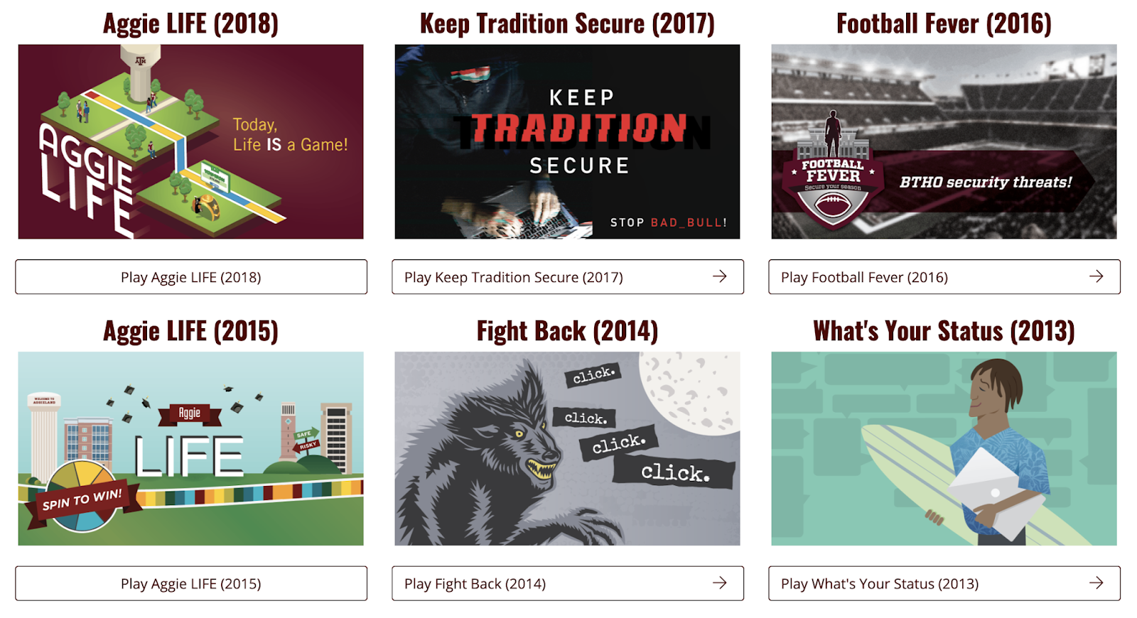 Но вернемся к теме заметки. Несколько примеров онлайн-игр по ИБ. Каждый год ИТ-департамент Университета Техаса, в рамках национального месячника ИБ, подготавливает новые игры по ИБ для своих сотрудников и студентов. Но и все желающие тоже могут поиграть в них, а может и почерпнуть какие-нибудь идеи для своих игры. Уже доступно 7 игр - https://it.tamu.edu/security/cybersecurity-games/index.php