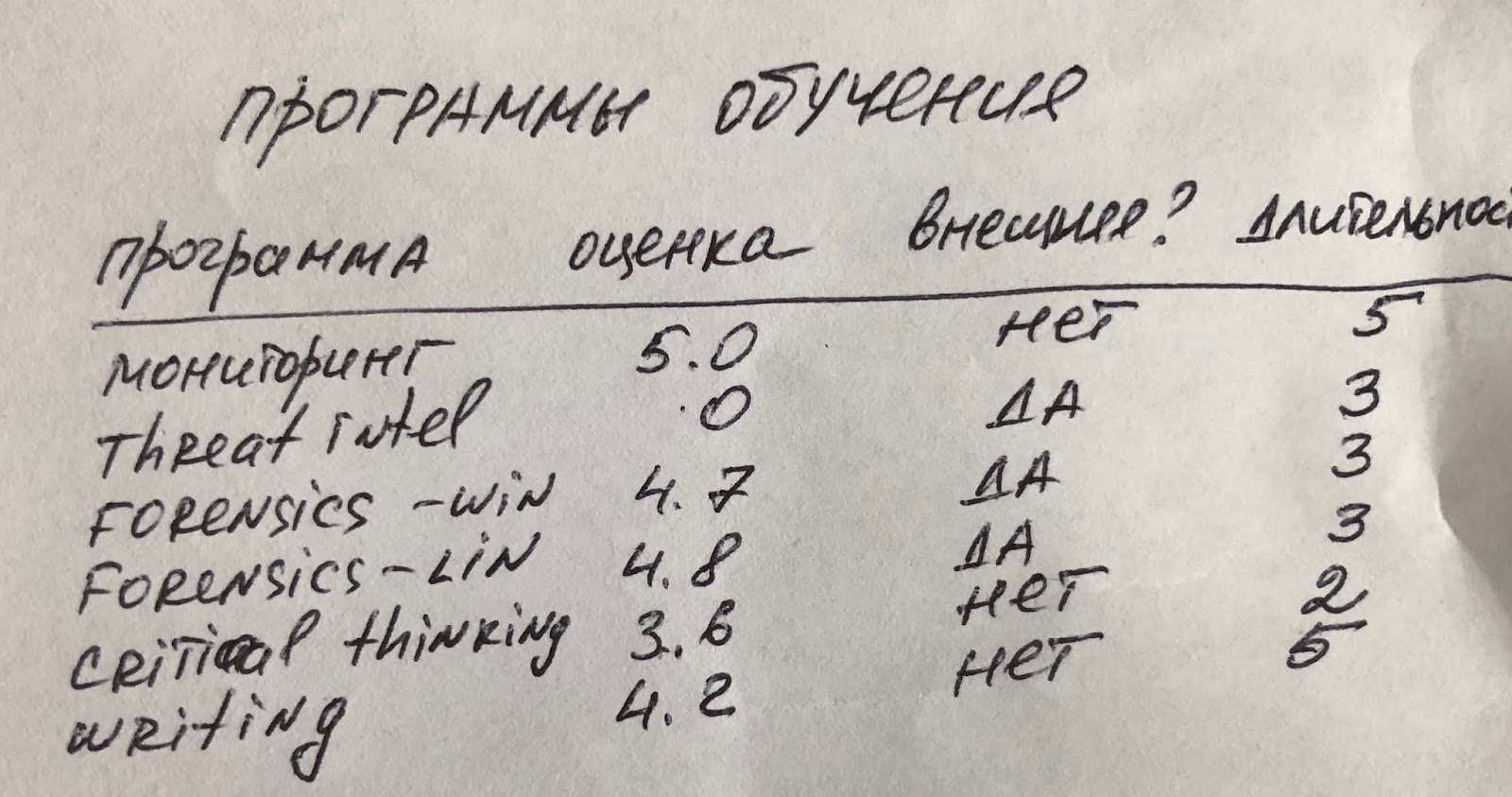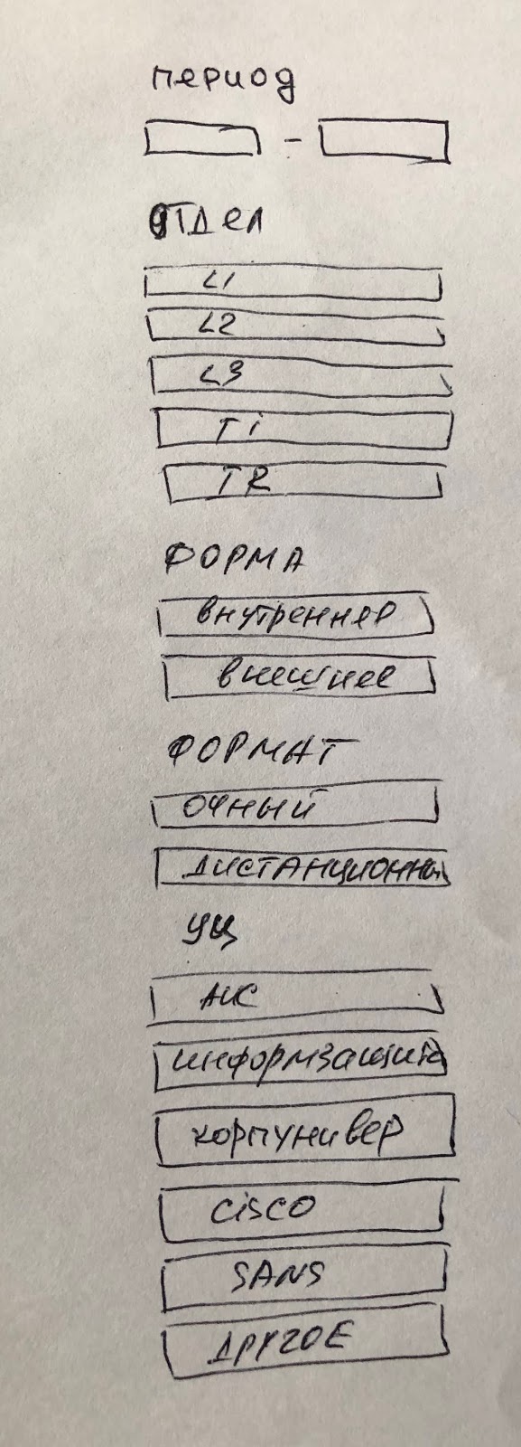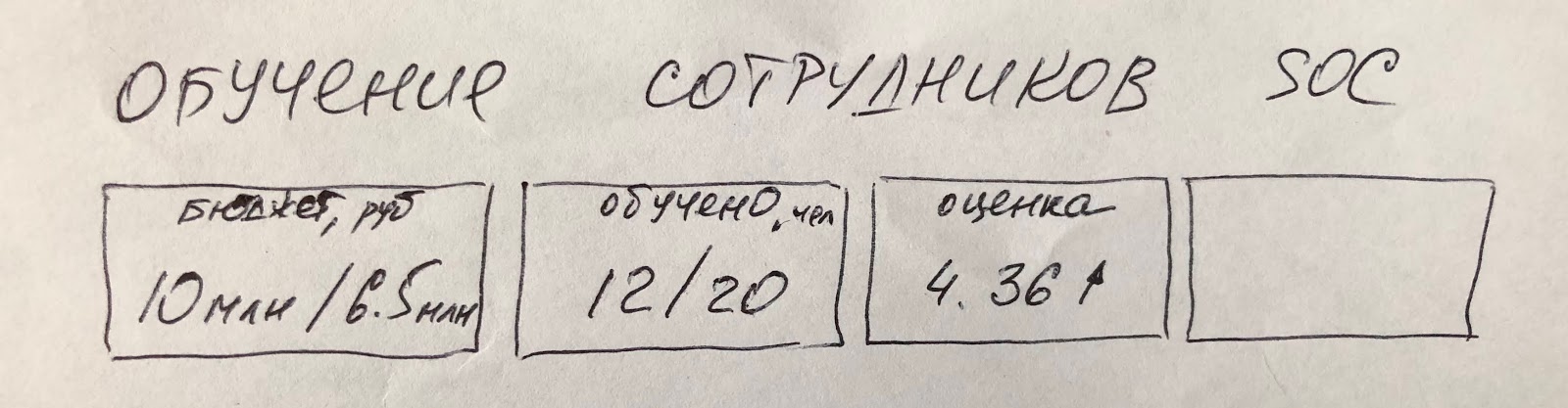 По прошлой заметке, посвященной дашборду оценки персонала в SOC, в одном из закрытых чатиков по SOCам возник вопрос относительно верхнего крайнего правого прямоугольника (KPI) с показателем по обучению. Мол, он не был раскрыт на дашборде кроме последнего блока по квалификации аналитиков разных подразделений SOC. Это действительно так, потому что в заметке описывался от руки нарисованный прототип, который затем не только дорабатывался до своего финального вида (с соответствующей цветовой раскраской и применением микро-графиков), но и был только частью набора дашбордов, описывающие различные аспекты работы с персоналом. Я просто показывал пример. Чтобы ответить на вопрос про дашборд с обучением аналитиков SOC, я и пишу данную заметку, показывая еще один прототип.