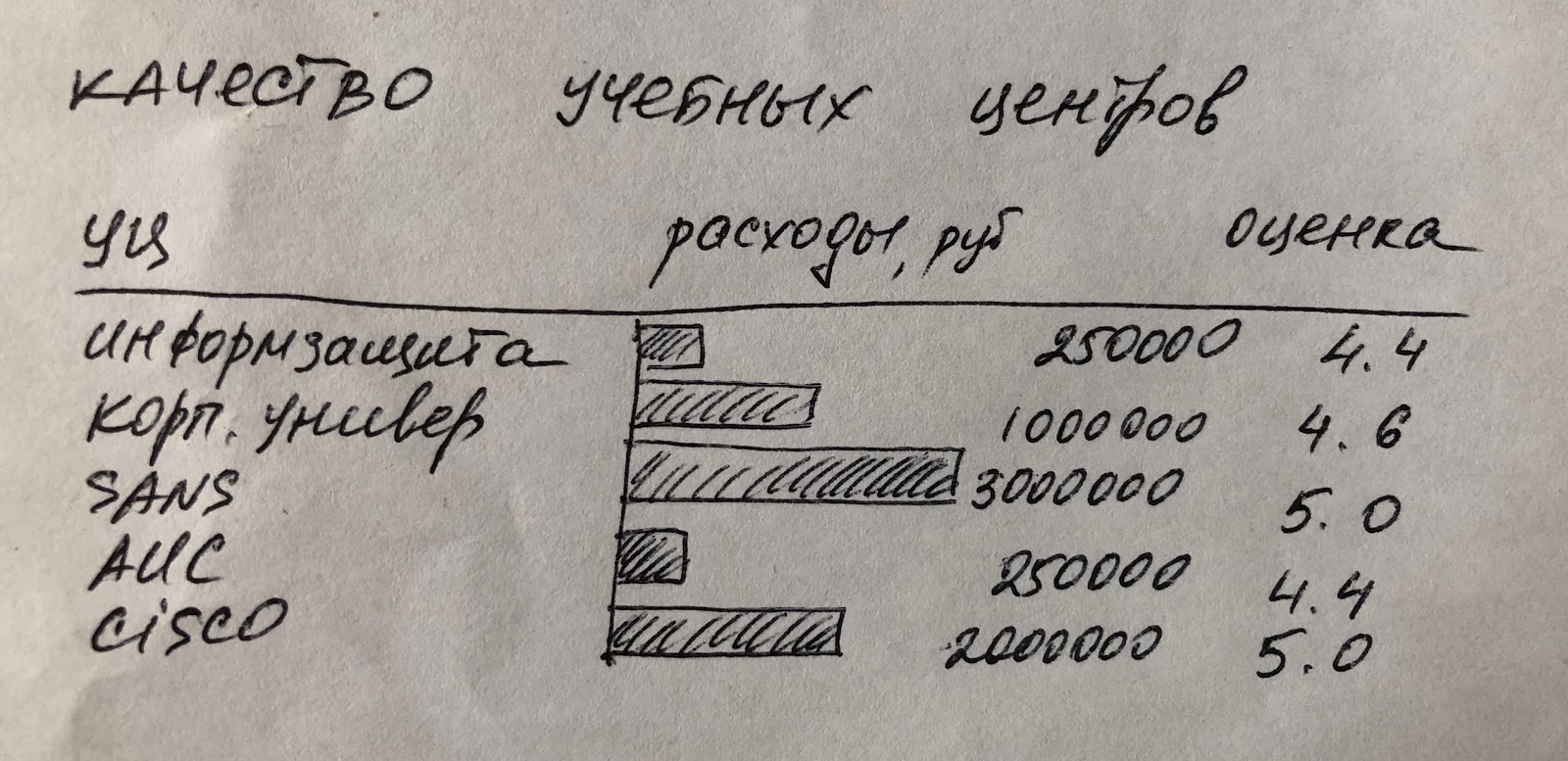 Не желая тратить деньги провайдерам, которые не удовлетворяют нашим требованиям, мы разработаем виджет для рейтинга качества учебных центров. В тех случаях, когда провайдер предоставляет бесплатное обучение, например, упомянутые выше CiscoLive и Defcon, нам будет важна третья колонка - с оценкой провайдера, которую мы получаем либо от уже обучившися сотрудников, либо берем чужую оценку (например, из Интернет).