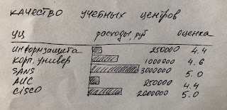 Итак, с точки зрения обучения меня интересует множество вопросов - от количества обученных/необученных сотрудников и потраченного/имеющегося бюджета на обучение, до форма и форматов обучения, а также рейтинга учебных центров или, что может быть более точным определением, провайдеров обучающих программ, которые могут быть представлены не только различными УЦ, но и другими организациями. Например, в примере ниже вы увидите Cisco, которая не являясь учебным центром (но имея сеть авторизованных УЦ, готовящих специалистов по программе обучения аналитиков SOC), при этом предлагая различные обучающие программы и треки (например, грядущий и бесплатный CiscoLive с треком по кибербезопасности, насчитывающим пару сотен докладов на столько же часов). Бесплатный (в этом году) виртуальный Defcon тоже может быть отнесен к провайдерам обучения.