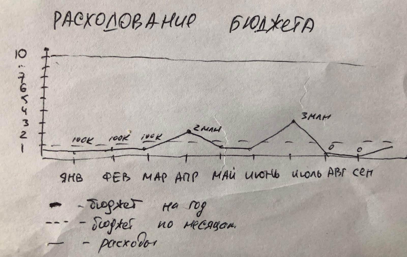 Наконец, очень важным является понимание расходования бюджета на обучение - насколько мы соблюдаем имеющийся бюджет и не выходим ли мы за определенные рамки. Выглядеть это может так (хотя уже после отрисовки я понял, что мы можем добавить еще один показатель - суммарные затраты на обучение, которые будут стремиться к значению годового бюджета):