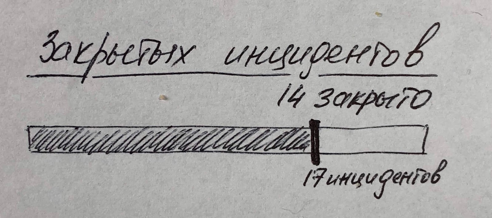 А можно копнуть глубже и посмотреть соотношение открытых и закрытых инцидентов (можно добавить еще большую детализацию, если указать тип инцидента или его приоритет или увязать инциденты с аналитиками). Показанный ниже пример интересен тем, что в нем используется не гистограмма (которая для визуализации соотношения вообще не подходит) и даже не диаграмма, которая просто показывает соотношение числа открытых и закрытых инцидентов, а "бегунок", который лучше визуализирует не только соотношение, но и стремление к цели (то есть сокращение числа незакрытых инцидентов). И тут важно помнить, что мы говорим о стремлении свести к нулю не число инцидентов (это невозможно), а число именно незакрытых инцидентов.