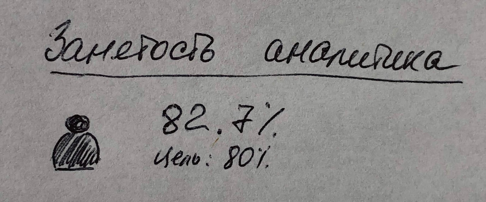 Еще одним интересным виджетом может стать "занятость аналитика". Обычно мы считаем, что человек работает весь рабочий день, с 9-ти до 6-ти или с 9-ти до 9-ти или в каком-то ином режиме, в зависимости от длительности смен. На самом же деле, может оказаться так, что аналитик отлынивает от работы, много времени отдыхает, перекуривает и т.п. Поэтому занятость аналитика, которая оценивается как отношение суммарного времени, затраченного на работу с инцидентами (легко оценивается в IRP/SOAR-платформе), к общей длительности смены, является очень хорошим показателем. На виджете ниже вы видите, как его можно визуализировать. Мы видим не только текущее значение для всех аналитиков или какого-то конкретного из них, но и целевое значение. В рабочей версии виджета мы можем использовать фотографии аналитиков и цифровую дифференциацию в зависимости от попадания или нет в целевые значения.