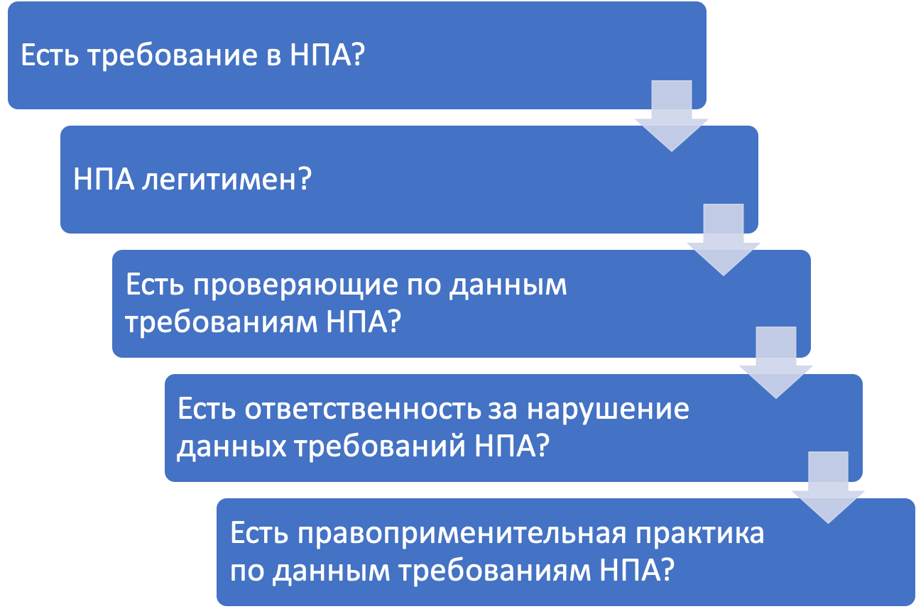 Итак, процедура состоит из ответов всего на 5 вопросов. Первый из них звучит просто - "есть ли данное требование в НПА?". Да-да, очень часто мы спорим о требованиях, которых просто нет в нормативных актах, а он являются скорее примером "испорченного телефона". Набивший оскомину, но при этом оставшийся классическим пример связан с сертификацией средств защиты информации. Такого требования, например, а ФЗ-152 (о персональных данных) или ФЗ-187 (о КИИ) нет, но многие почему-то просто жаждут применения таких средств из все больше и больше сокращающегося списка. Поэтому я рекомендую в таких случаях самостоятельно читать НПА. Или вот вопрос о мифических требованиях ФСБ к средствам ГосСОПКИ. Таких требований нет, но я упорно слышу от заказчиков, которые услышали это ряда отечественных вендоров, что требования якобы есть и их надо выполнять.
