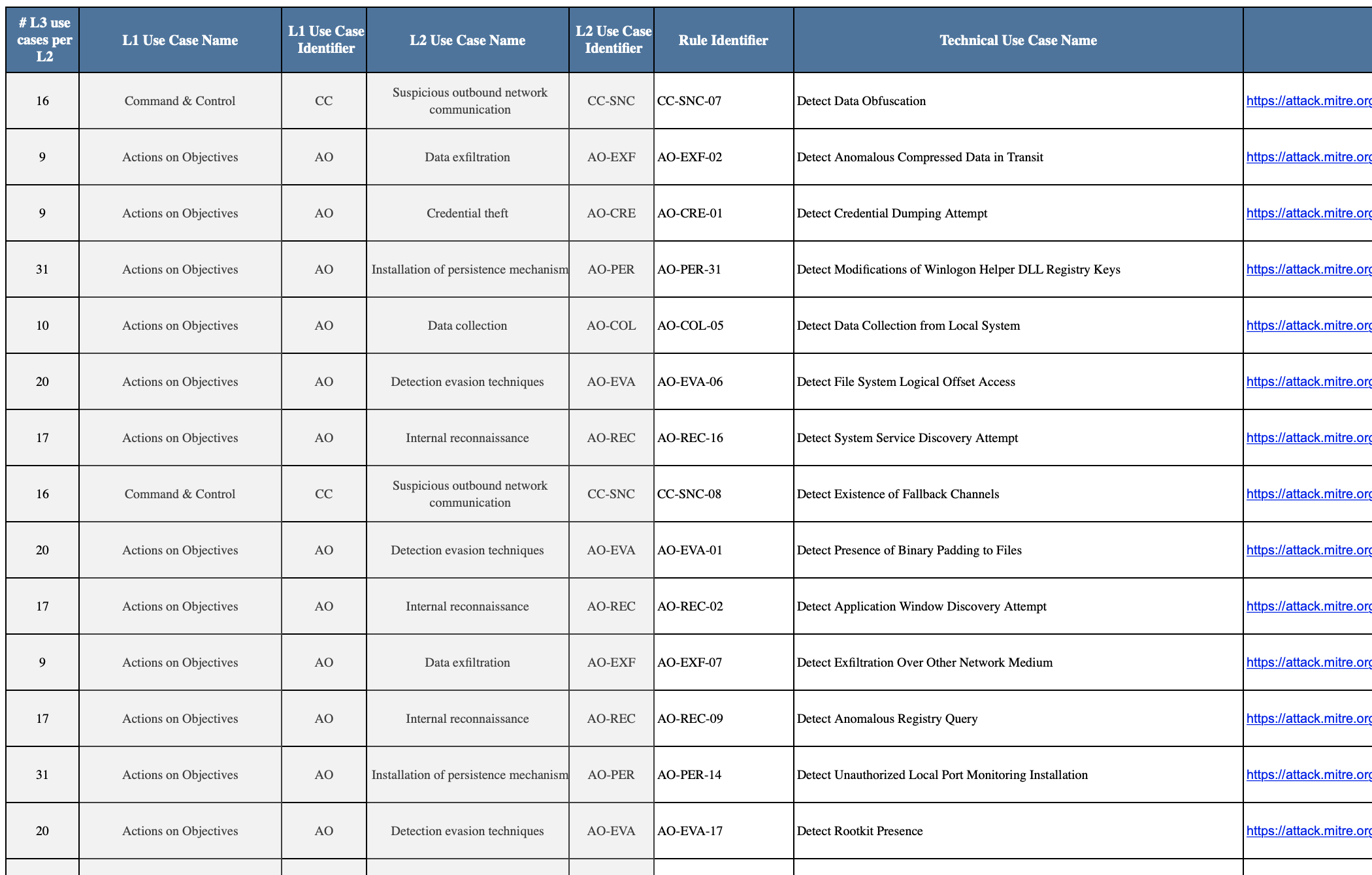 Например, выдали табличку с кучей готовых use cases с их разбиением по L1-L3, привязкой к матрице MITRE ATT&CK, метриками и оценкой их эффективности. Полезная штука - мы в рамках наших проектов по SOC тоже используем схожую табличку в Excel, куда заносятся все Use Case, которые мы разрабатываем и с которыми потом можно работать, а не просто теоретизировать.