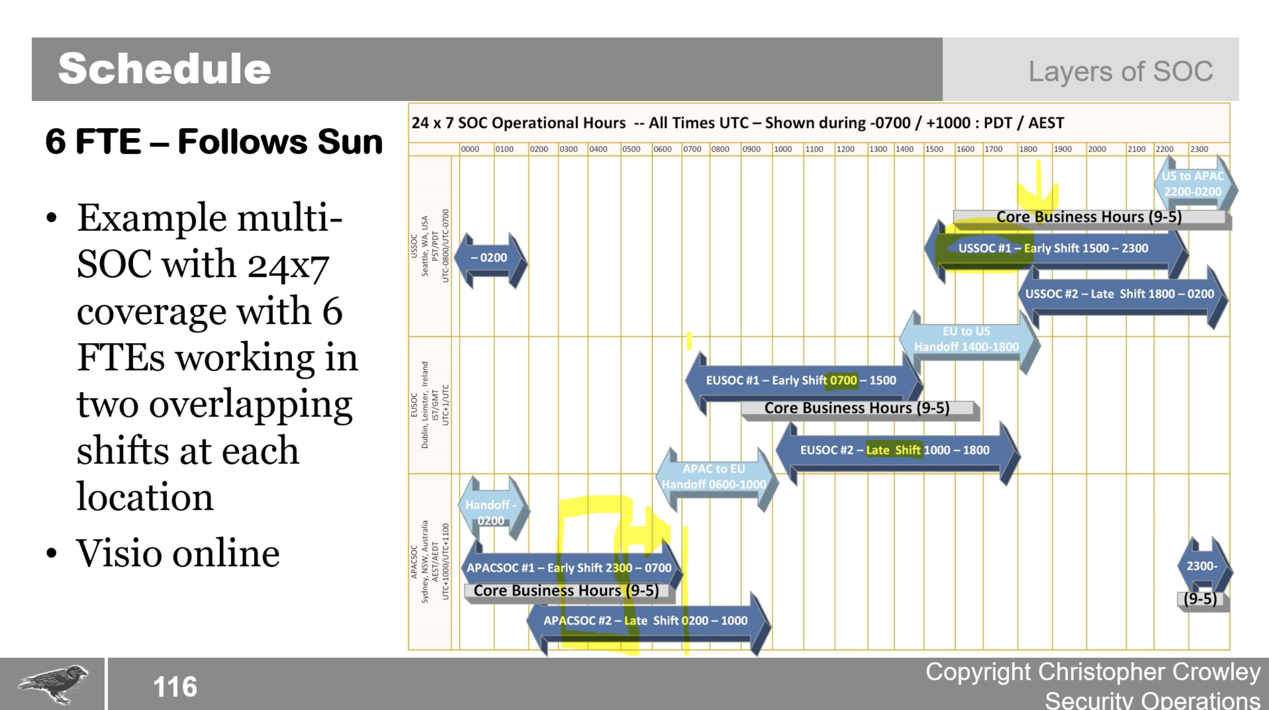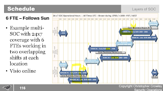 С выбором связана и тема смен в SOCах. Крис давал различные модели и описывал их плюсы и минусы. Полезная тема с точки зрения планирования работ персонала и определения численности сотрудников SOC.