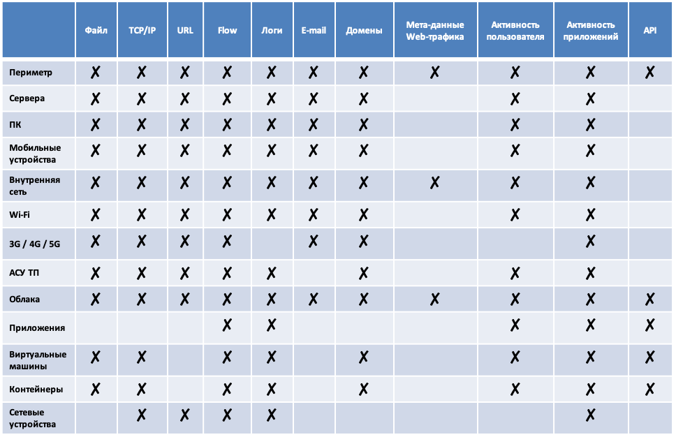 Я уже как-то приводил эту табличку, но решил обновить ее с учетом проектов, в которых участвовал. В столбцах указаны возможные источники данных, а в строках я попробовал указать модули корпоративной инфраструктуры, которые нам интересны с точки зрения обнаружения угроз. Наличие крестика в ячейках на пересечении строк и столбцов означает, что там есть, что анализировать. Попробуйте применить эту табличку к своей инфраструктуре и посмотреть, насколько вы далеки или наоборот приближены к более-менее эффективной системе обнаружения вторжений.