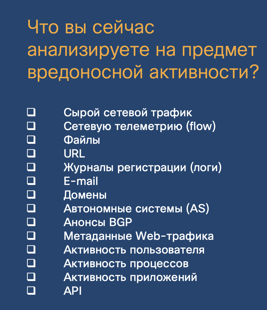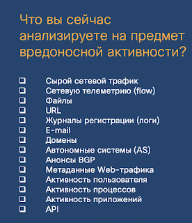Задайте себе простой вопрос - что вы сейчас анализируете на предмет вредоносной активности и в чем вы ищете ранее обсуждаемый контент обнаружения? Сетевой трафик? Логи? Телеметрию? Файлы? URL? Почтовый трафик? Активность пользователей и процессов? А анонсы BGP? А API? А DNS-трафик?
