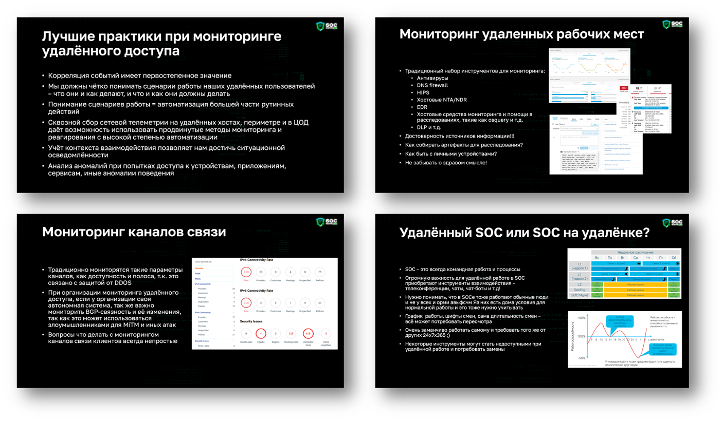 Вторым довелось выступать мне - я заменял внезапно заболевшего Руслана Иванова из Cisco. Удивительно, что несмотря на 9 месяцев самоизоляции, которая поменяла подходы к ИБ в организациях и, соответственно, к мониторингу ИБ, про коронавирус на SOC Live не говорил почти никто. Я в презентации как раз и коснулся этого вопроса, уделив внимание тому, как мониторить удаленные рабочие места, облака, периметр, ЦОД и каналы связи. В заключение своего короткого выступления я коснулся того, как выстраивать работу самого SOC, если его аналитики сами переведены на удаленку. Но интересующимся последней темой я бы порекомендовал статью на Хабре, где этот вопрос раскрыт более детально, чем в презентации.