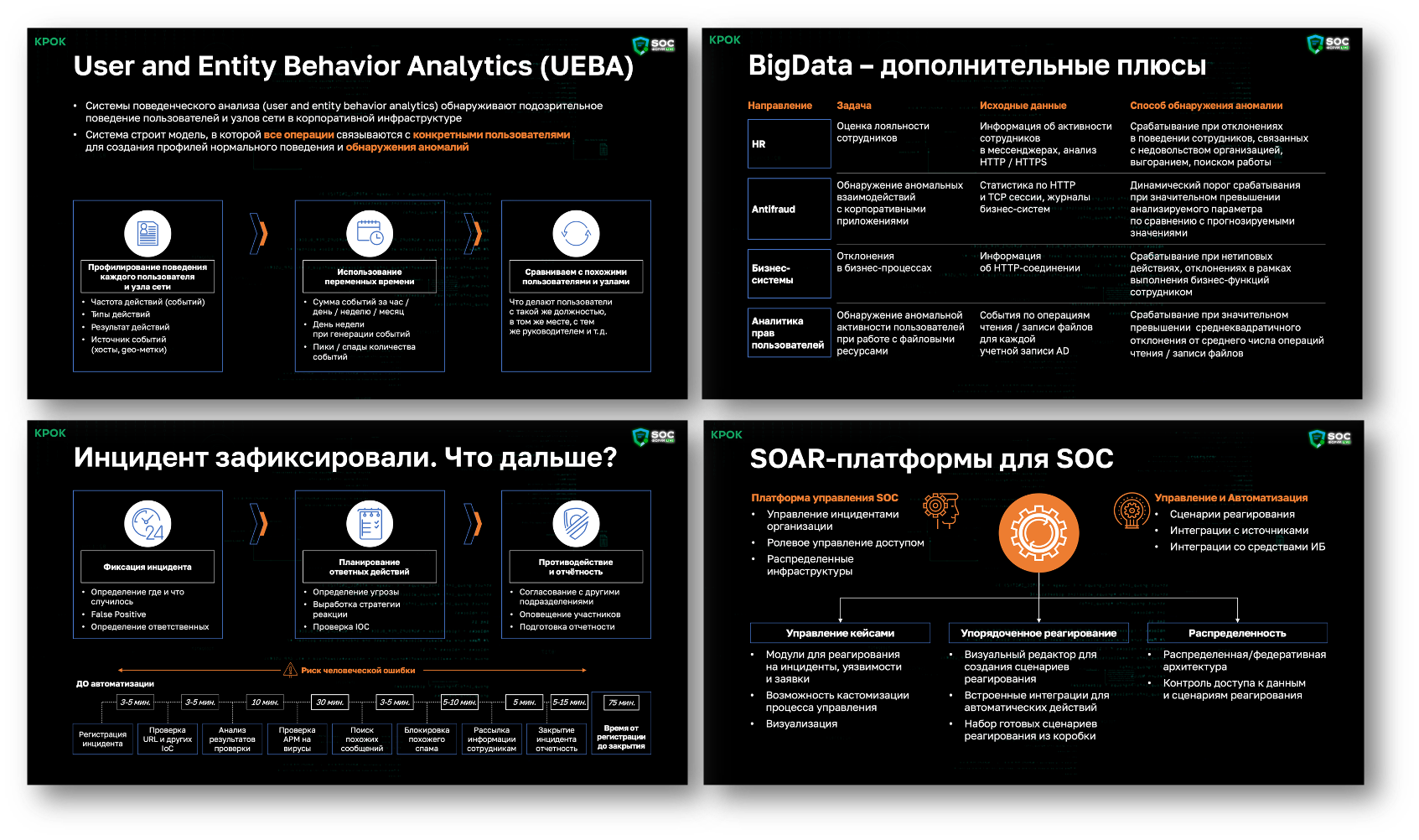 Завершавший этот поток Александр Черныхов из Крока, который напомнил слушателям, какие ключевые компоненты должны быть по его мнению в современном SOC. К ним он причислил SIEM, UEBA, SOAR и Big Data. Не знаю, я не очень согласен с такой постановкой вопроса и в этот список, как минимум, добавил бы еще TIP и THP, а к списку систем сбора событий, наряду с UEBA, добавил бы еще EDR, NTA/NDR и CASB. Но, возможно, просто времени не хватило, - все-таки за 20 минут рассказать можно не так уж и много.