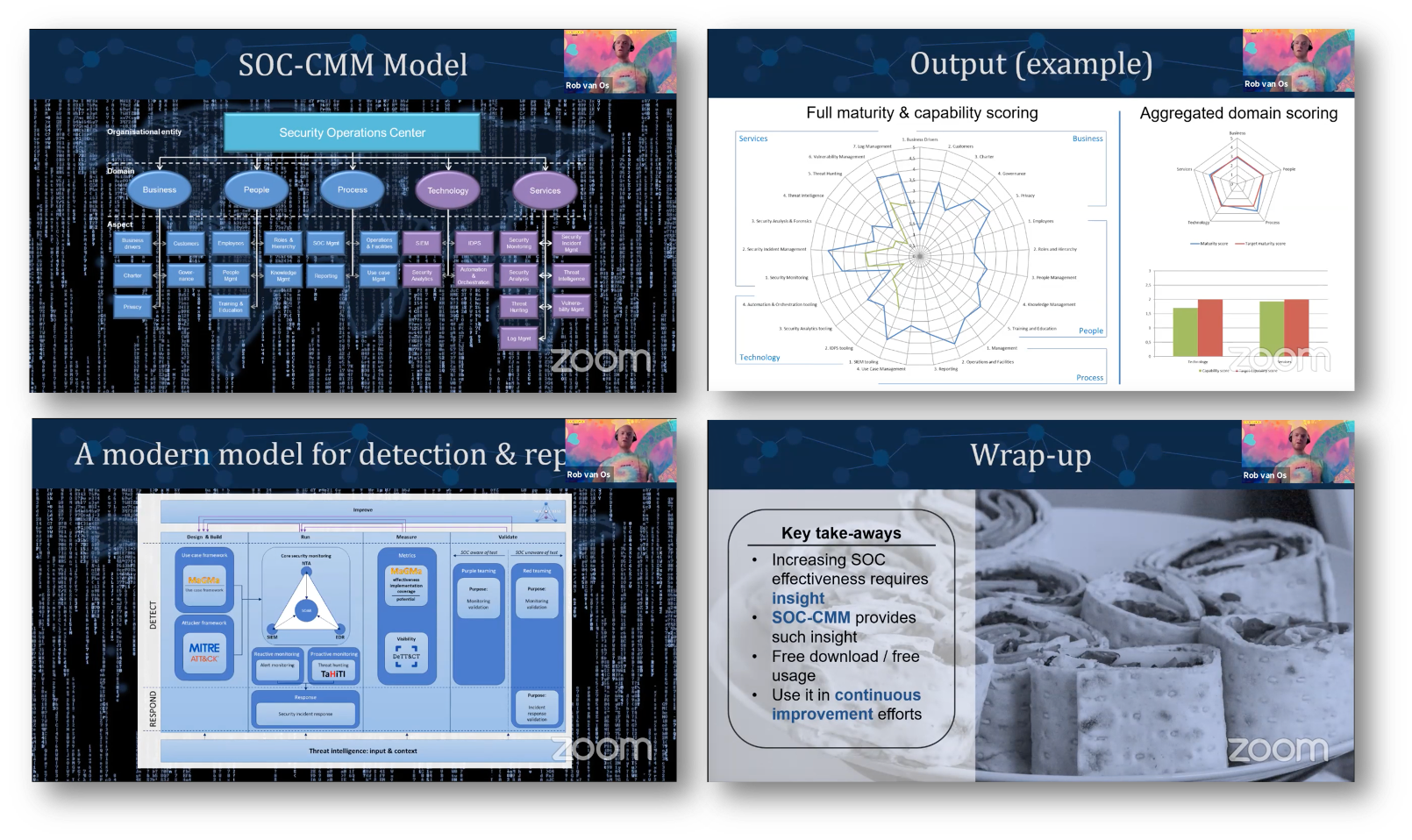 А вот Роб ван Ос не обманул ожиданий - рассказал и о том, как оценивать эффективность (про это спрашивали многих докладчиков и участников пленарных сессий) и зрелость центра мониторинга, и какие модели использовать для оценки возможностей SOC и т.д. Кстати, на последний вопрос, как ни странно, ответ оказался не модель