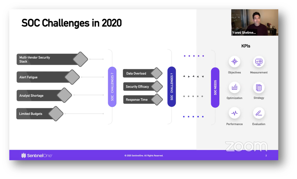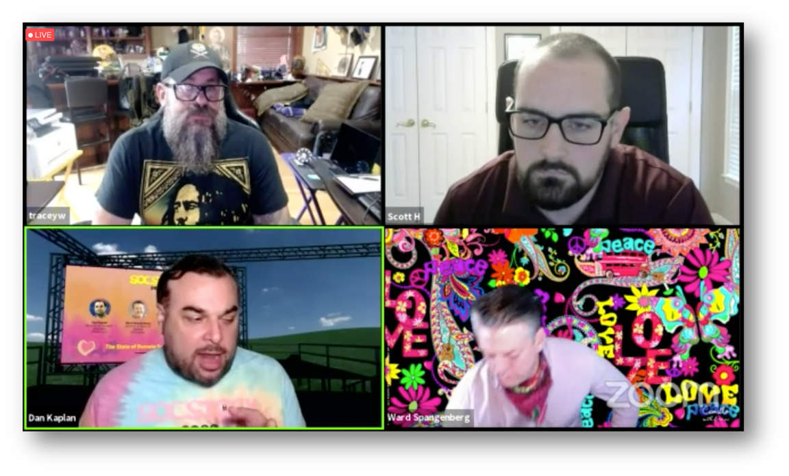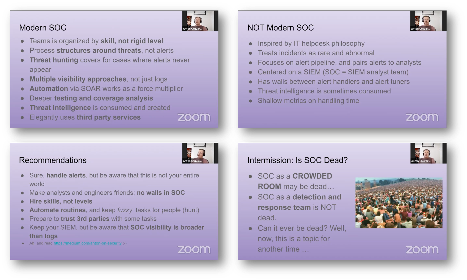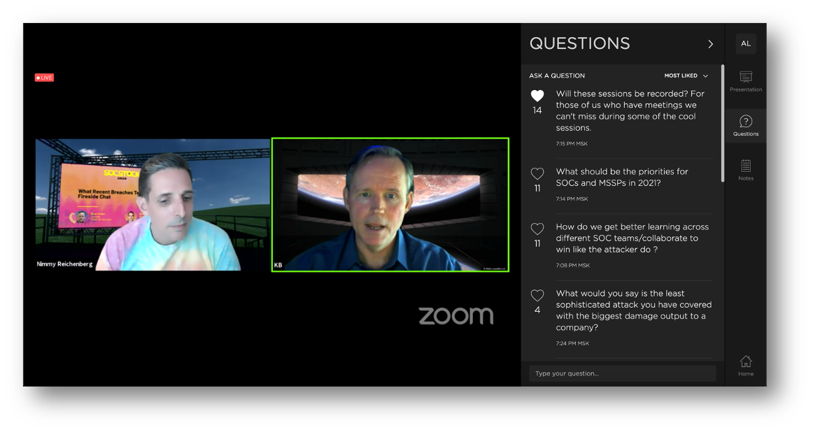 В последовавшей за ключевым докладом дискуссии руководители нескольких американских SOCов рассказывали о текущем состоянии своей деятельности. Пересказывать ее не имеет смысла - ее надо слушать. Кстати, о том, почему везде висит значок Zoom. В отличие от SOC Live, в котором спикеры участвовали очно из студии, спикеры SOCstock подключались с разных концов США и поэтому собрать их вместе не предстаавлялось возможным. Поэтому видео-поток с Zoom транслировался уже через платформу мероприятия. Было не так живо, как на SOC Live, но иначе и не получилось бы для такой децентрализованной страны как США.