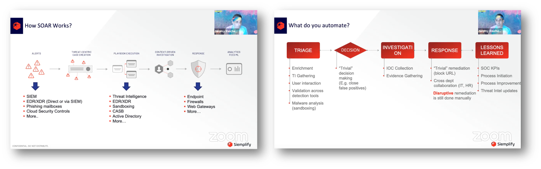 Не менее интересным был доклад и от компании Siemplify, которая рассказала как о том, что такое SOAR и зачем нужна автоматизации в SOC, так и привела немало сценариев, в которых автоматизация действительно помогает специалистам по мониторингу ИБ. Причем это были как достаточно стандартные сценарии типа фишинговой атаки или подбора пароля, так и менее распространенные, такие как утечка данных из облака или обработка фидов о киберугрозах во время пандемии COVID-19.