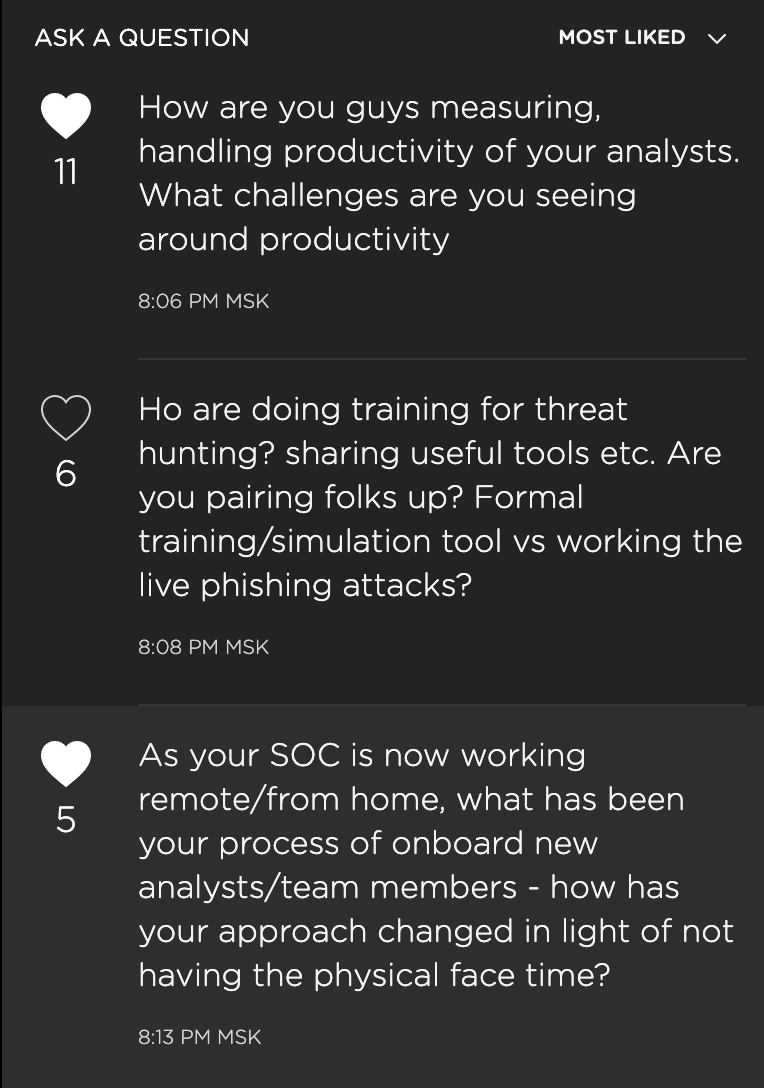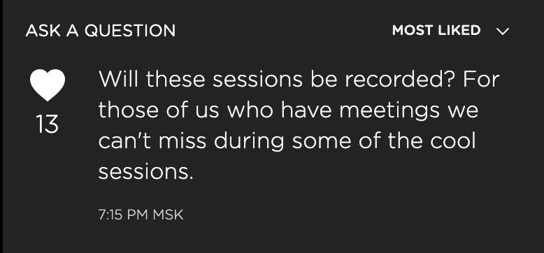 Можно также сделать рейтинг вопросов, чтобы сами зрители/участники могли голосовать за понравившиеся им и те, что наберут большее число баллов, сразу поднимались бы в списке вопросов на самый верх. - Возможность обсуждения конкретного доклада/выступления. Иметь отдельный канал/комнату для этого очень важно. Иногда хочется поделиться своим опытом или показать себя или послушать других. Так формируется своя жизнь вокруг мероприятия, которая может быть даже ценнее трансляции самих докладов.