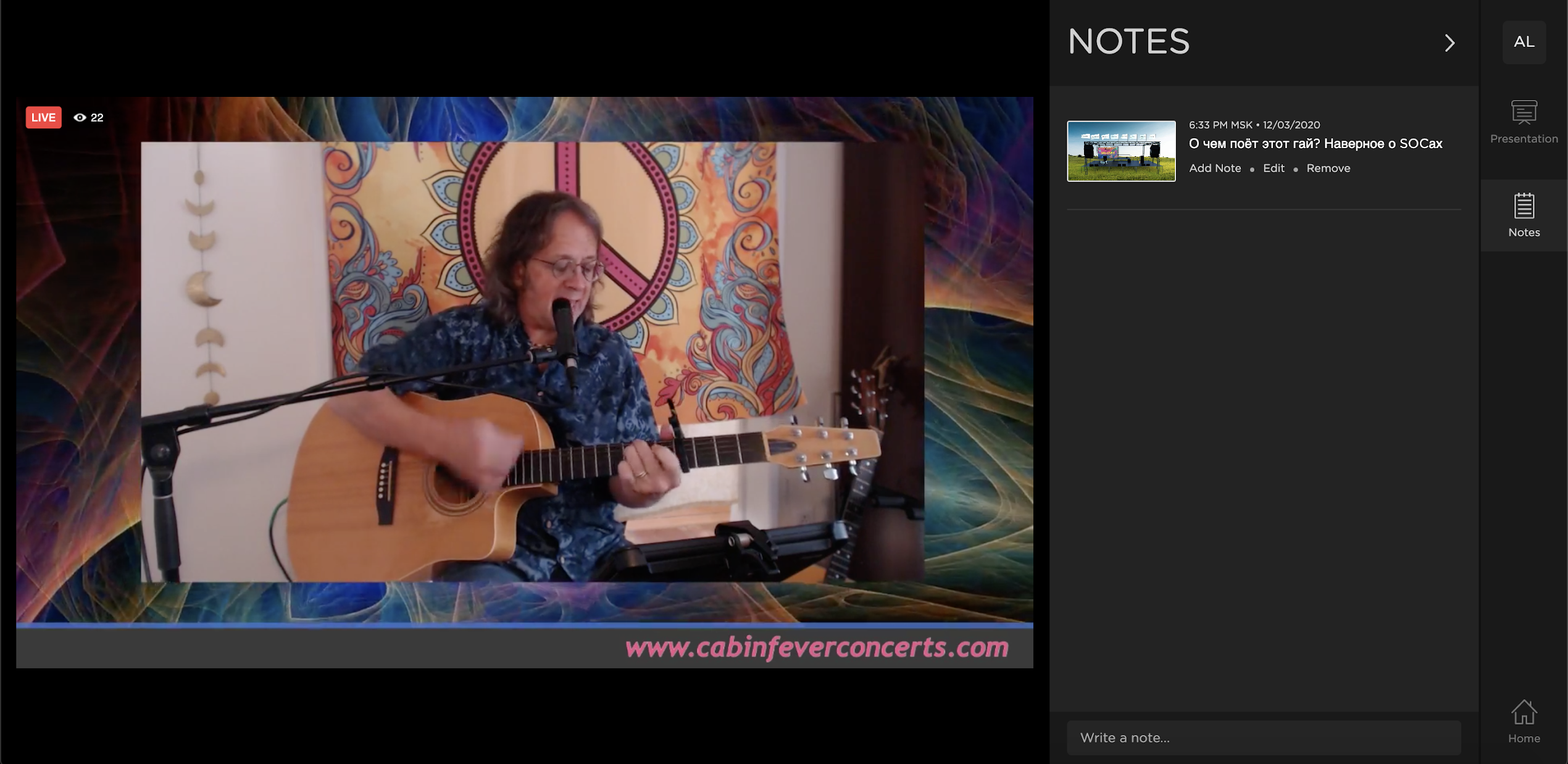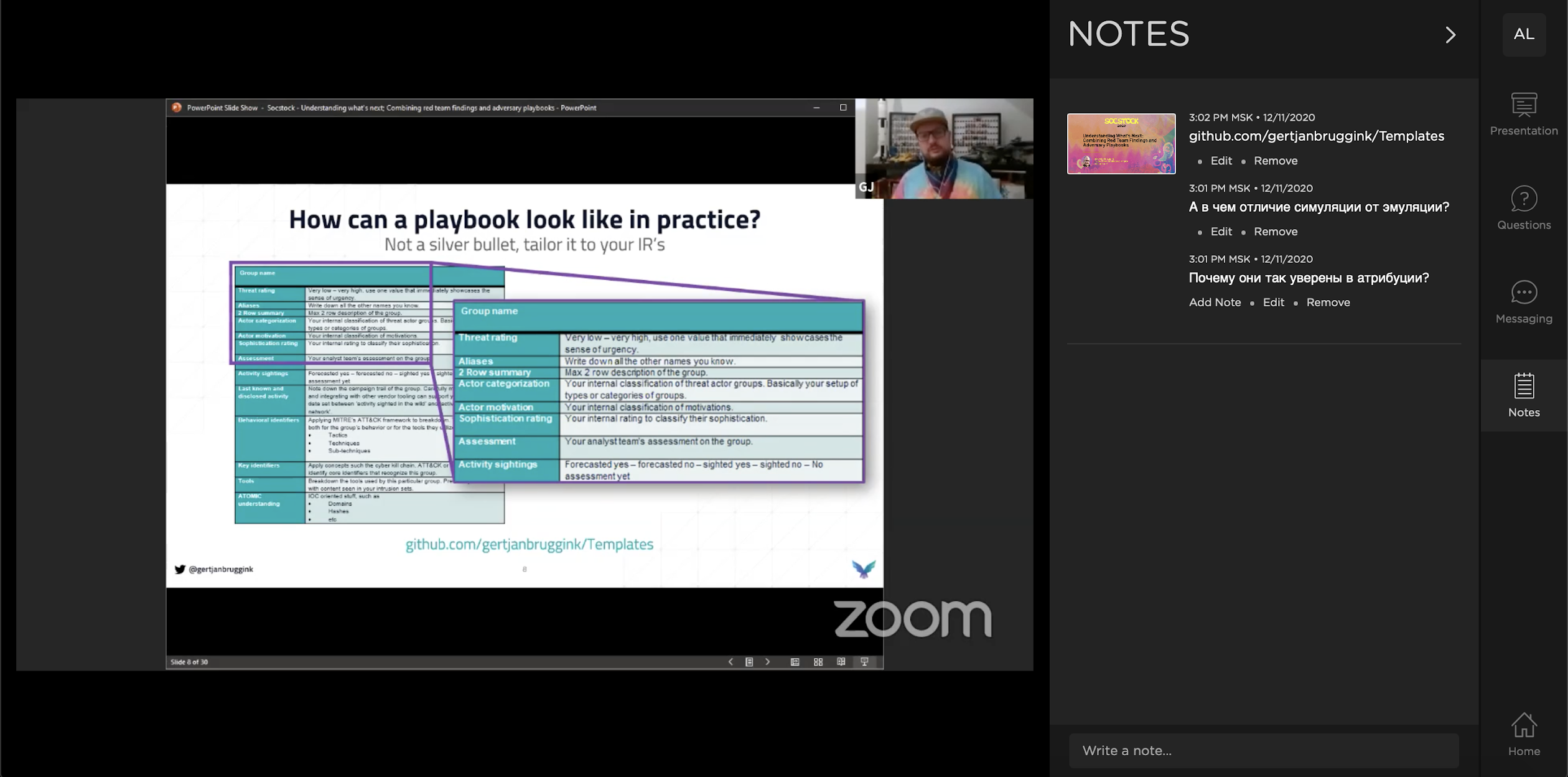 Обратите внимание на секцию Notes справа - она для собственных заметок - Возможность подсвечивать важные комментарии, например, от ведущих или модераторов, уведомления от организаторов и т.п. Это можно делать как в чате/канале/комнате, так и делать общий для всего мероприятия Live Feed.