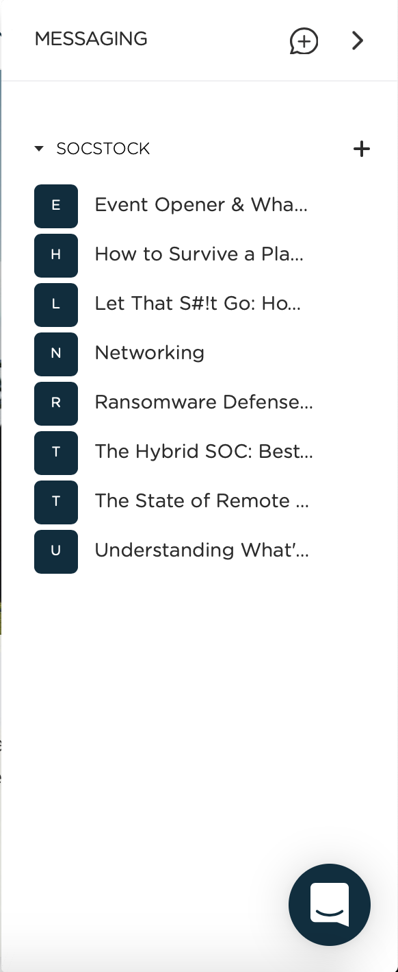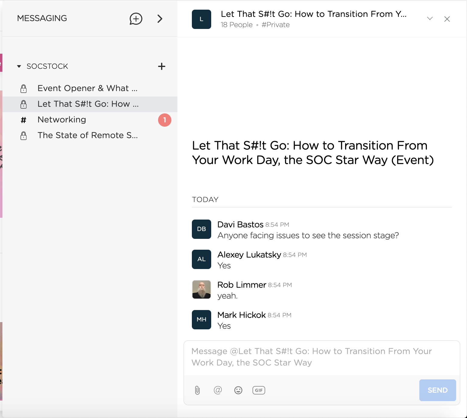 Здесь виден набор каналов/комнат, в которых участвует слушатель - Возможность задания вопросов спикерам. Это должен делать или модератор, который разбирается в теме и выбирает из пула пришедших вопросов интересные, или сам спикер должен видеть вопросы и иметь возможность ответить на них. При этом вопросы надо задавать не в общем чате, а именно в рамках того самого выступления, которое интересует.