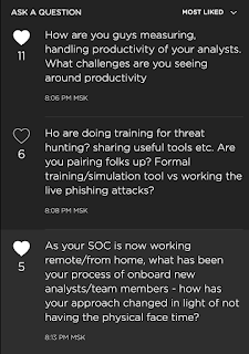 Надысь принимал я участие в одном виртуальном мероприятии крупной ИТ-компании, которая, имея в своем портфолио решения для проведения нормальных видео-конференций и сервисов для групповой работы, почему-то выбрала Zoom. И дело не в том, что Zoom - это решение для домашнего пользования и еще долго не станет корпоративным инструментом с точки зрения отношения к ИБ, а в том, что Zoom не позволяет организовать именно конференции с разными докладчиками, в несколько потоков, с нормальной обратной связью и т.п. А тут еще прошли SOC Live и SOCstock, в которых мне тоже довелось участвовать.. Так что у меня накопилось некоторое количество наблюдений и идей, которые необходимо учитывать, чтобы превратить вебинар на стероидах, как говорит Денис Горчаков, в полноценное мероприятие, на котором интересно.