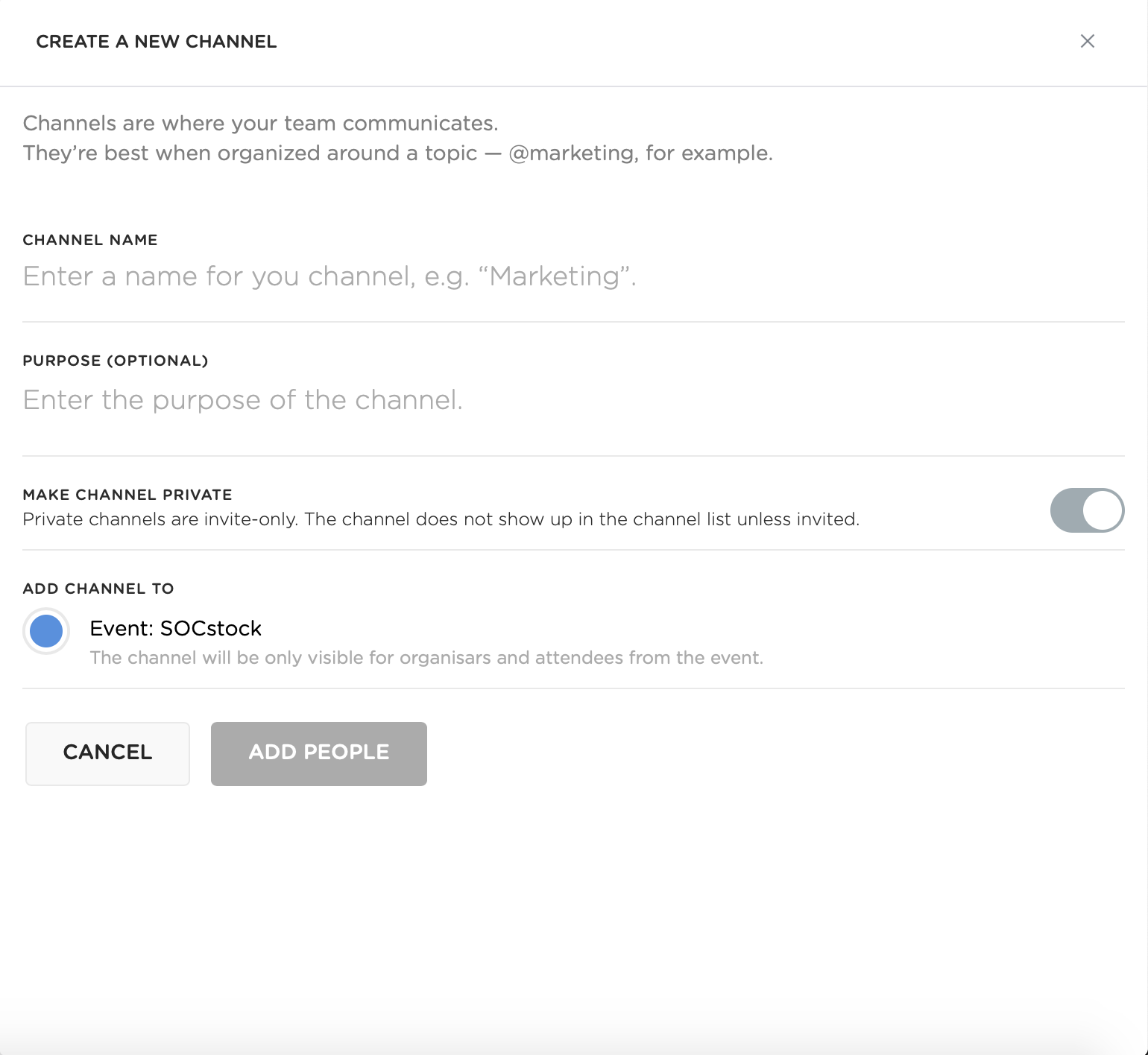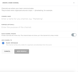 Справа область отображает ваши каналы общения, а слева общее меню мероприятия - Возможность самому инициировать какие либо обсуждения (свой канал/комната).