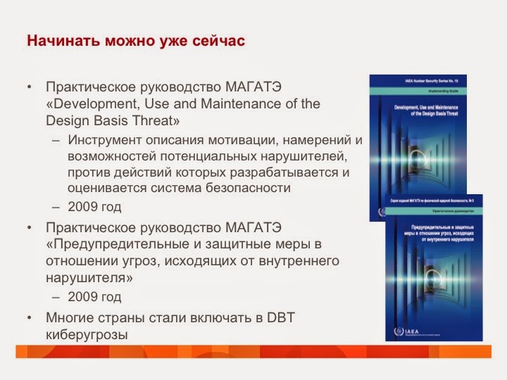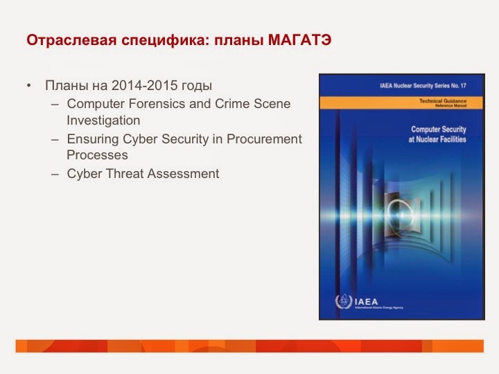 Найти эту специфику, применительно к информационной безопасности, оказалось не так уж и сложно. МАГАТЭ еще в 2003-м году начала разработку соответствующего документа "Компьютерная безопасность на ядерных установках", который увидел свет в 2009-м году, а в 2012-м он был официально переведен и на русский язык.