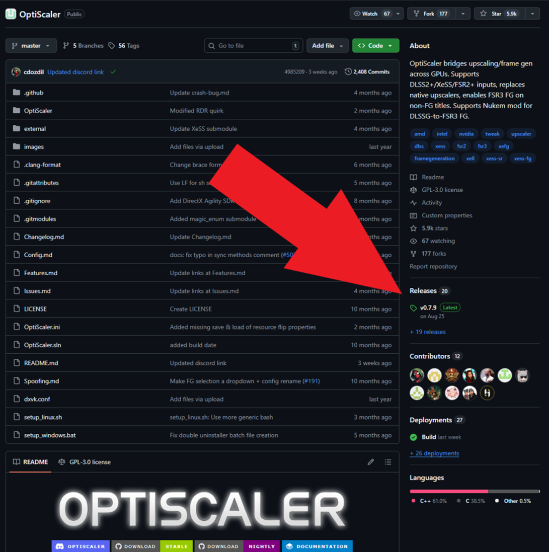 Чтобы начать работу, необходимо скачать мод с официальной страницы GitHub: https://github.com/optiscaler/OptiScaler. Перейдите в раздел Releases и выберите последнюю стабильную версию.