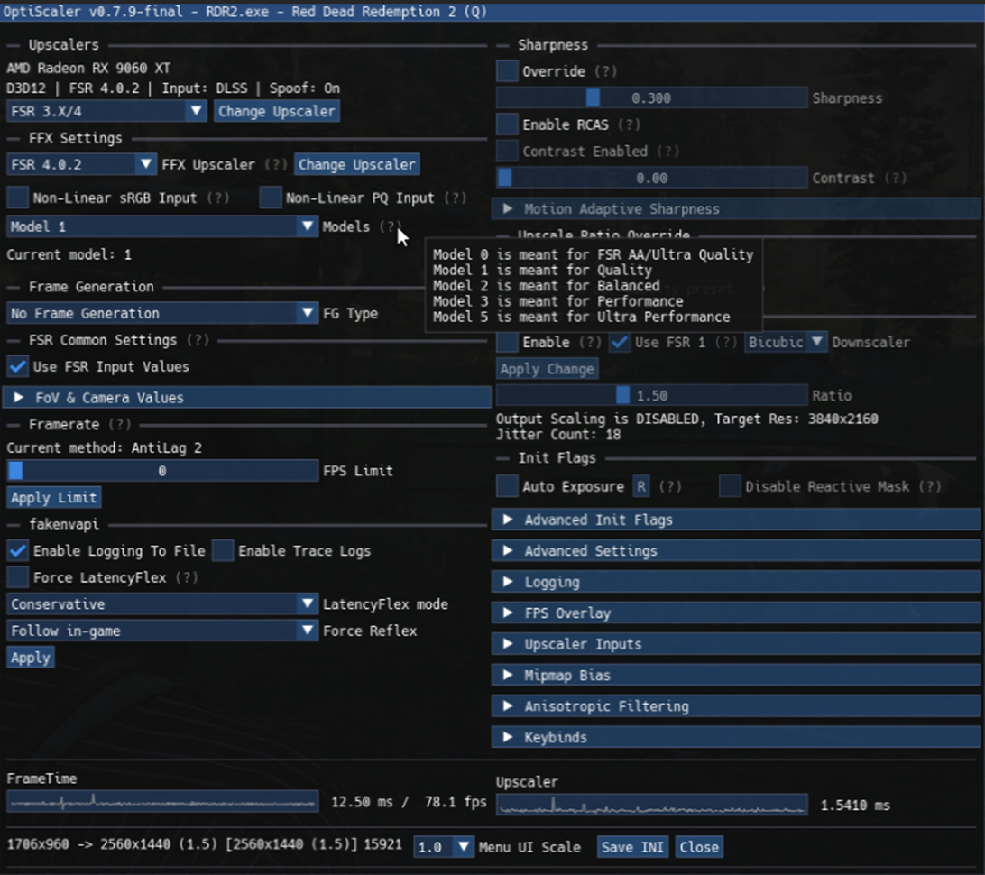В интерфейсе Optiscaler выберите режим FSR3.X/4, а затем модель апскейлинга:
