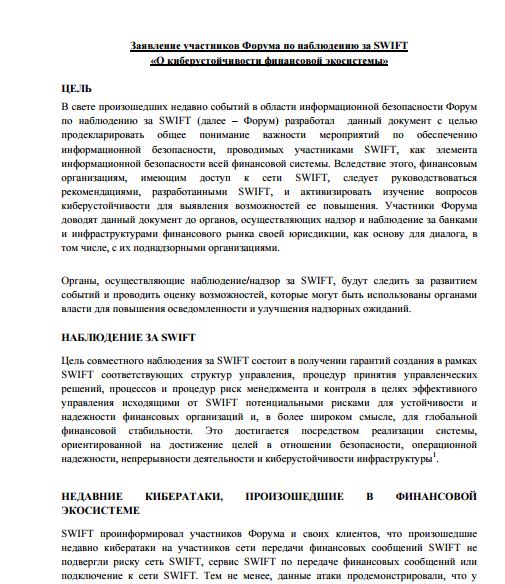 Атаки хакеров через систему SWIFT заставили представителей центральных банков ряда стран, включая и Россию, сделать определенные выводы, которые нашли отражение в под названием «О киберустойчивости финансовой экосистемы».