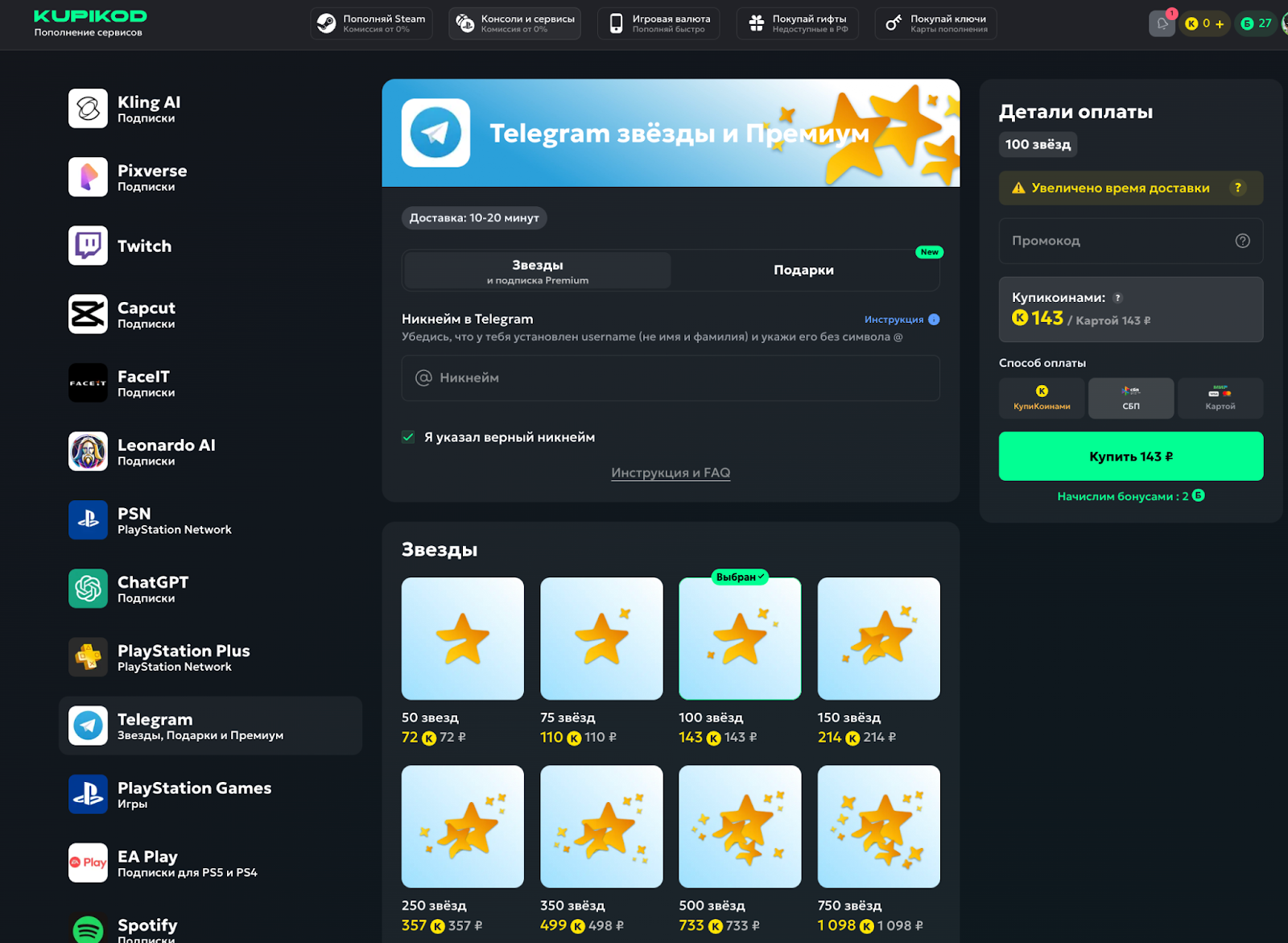 Kupikod — площадка, где можно купить звезды Телеграм дешево, с поддержкой СБП и моментальной выдачей;