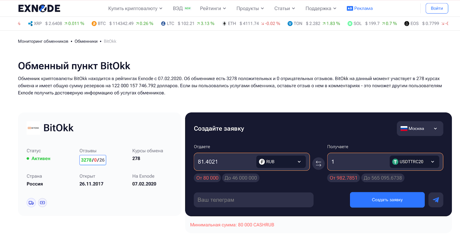 Надёжнее всего искать такие обменники через сайт мониторинга Exnode. Здесь собраны актуальные курсы, рейтинги и отзывы пользователей, что позволяет легко сравнить условия и выбрать лучший вариант без риска нарваться на мошенников.