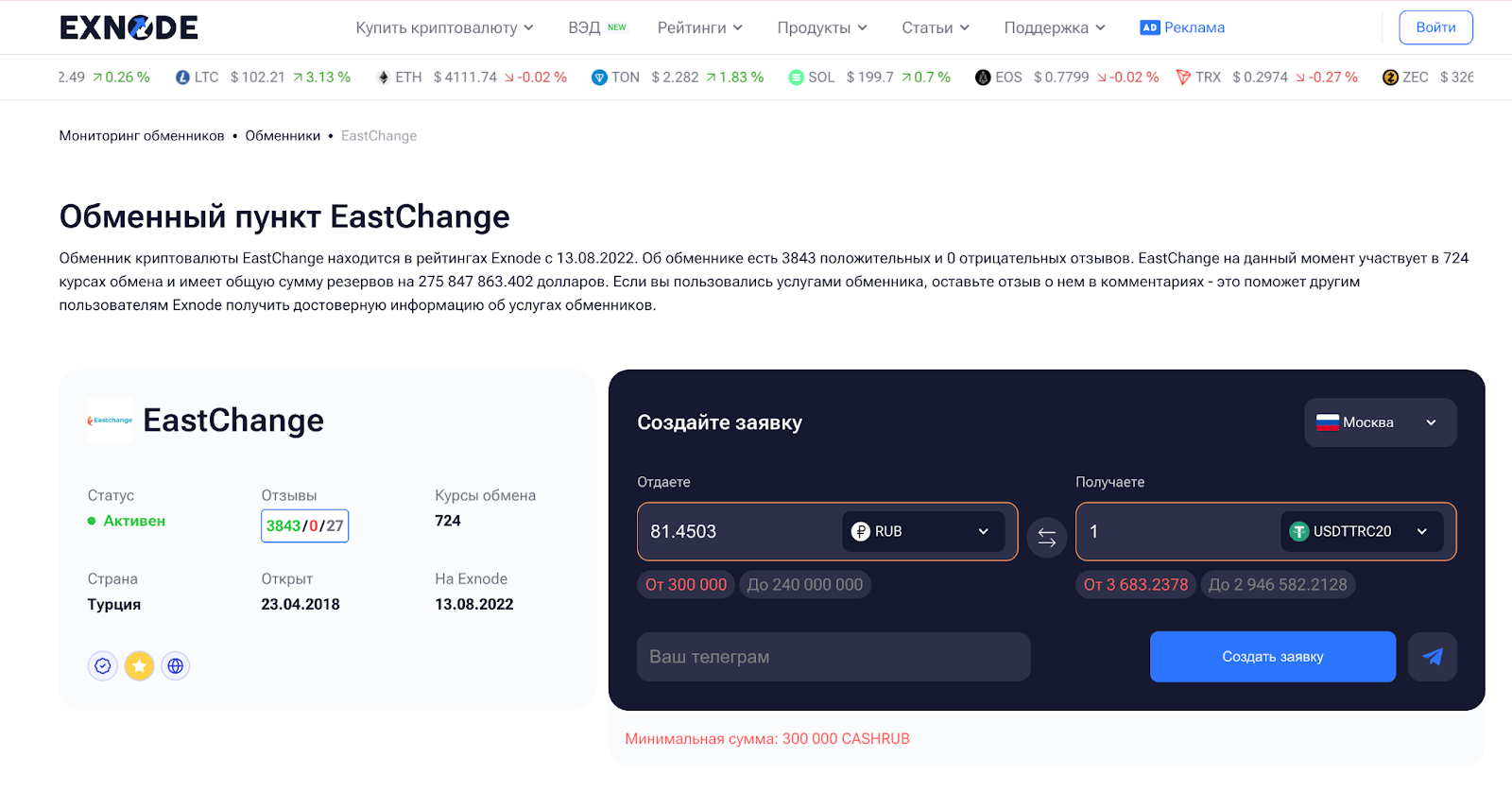 Название EastChange давно у всех на слуху, и эта компания действительно заслуживает доверия. Купить USDT TRC-20 за рубли здесь можно по биржевому курсу, и без комиссии. Для этого от вас потребуется персональный криптокошелек и смартфон с установленным мессенджером Telegram.