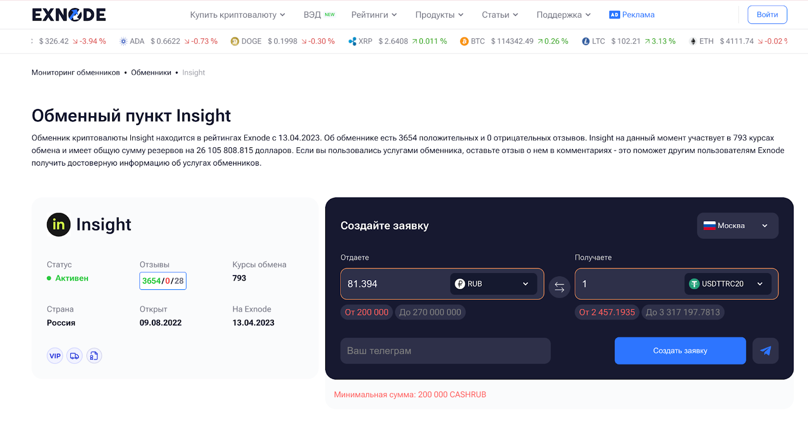 Еще один крупный обменный сервис, где купить USDT за рубли можно без риска и комиссий – это Insight. Он тоже принадлежит российской компании, полностью отвечает требованиям законодательства РФ и всегда выполняет обязательства перед клиентами. В числе прочих криптовалют здесь представлен и USDT на разных блокчейнах: с возможностью безкомиссионной покупки за наличные рубли, доллары и евро. Клиенты, уже воспользовавшиеся его услугами, отмечают: