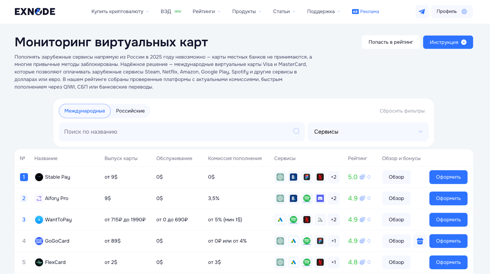 Первый и самый важный шаг — определиться с платформой. Чтобы понять, какую виртуальную карту можно оформить онлайн и не заблудиться в многообразии, целесообразно использовать специализированные ресурсы для сравнения. Такие сервисы, как Exnode, агрегируют актуальные предложения, позволяя сразу оценить комиссии, поддерживаемые валюты и условия. Это лучший способ найти вариант, где можно виртуальную карту оформить онлайн бесплатно без посещения офиса.