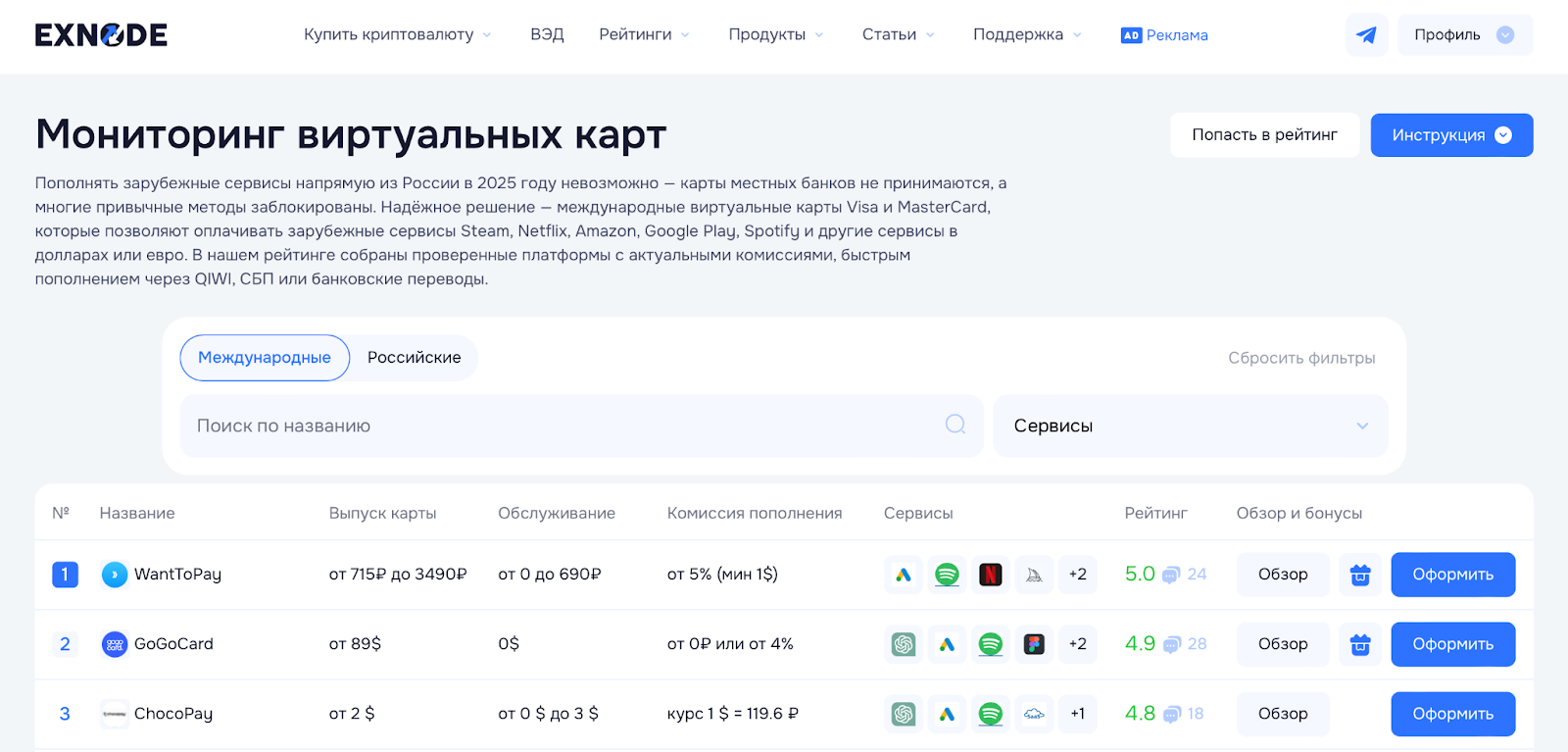 Однако разнообразие предложений на рынке может запутать. Чтобы выбрать действительно выгодный вариант, требуется сравнить десятки условий и комиссий. В этом может помочь специализированный мониторинг-сервис Exnode. Он аккумулирует актуальные данные, позволяя пользователю быстро сравнить тарифы и возможности разных платформ, чтобы виртуальную карту оформить бесплатно или с минимальными затратами, подобрав