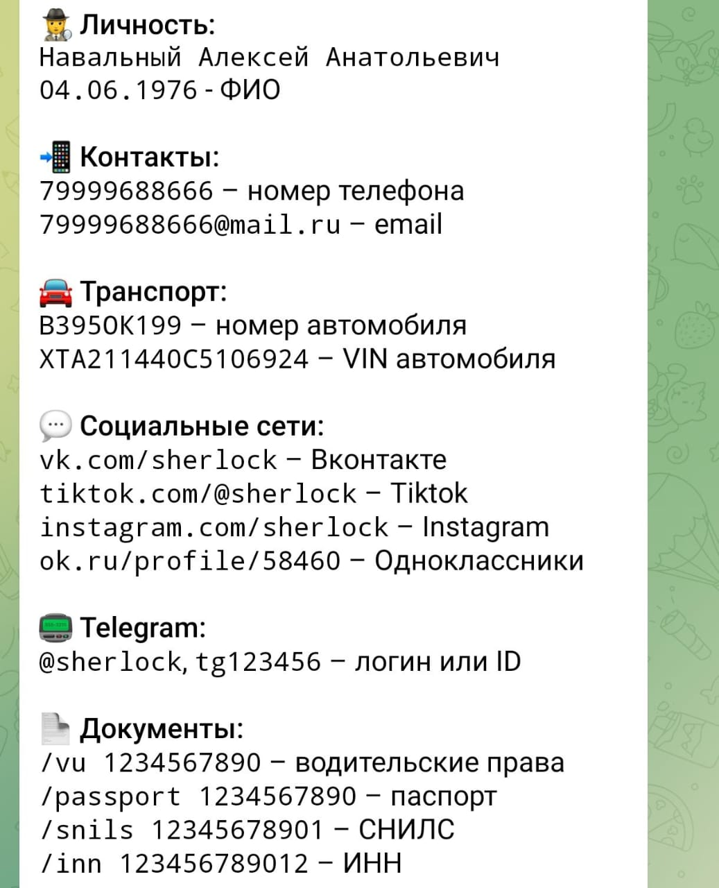 Важно отметить, что Шерлок - один из самых точных ботов для поиска информации. По номеру телефона бот находит ФИО, оператора сотовой связи, регион, страну, ФИО, дату рождения, возраст, контактные теги пользователя, соц. сети и многое другое. Из минусов - в последнее время наблюдаются проблемы с открытием отчетов пользователям в формате HTML.