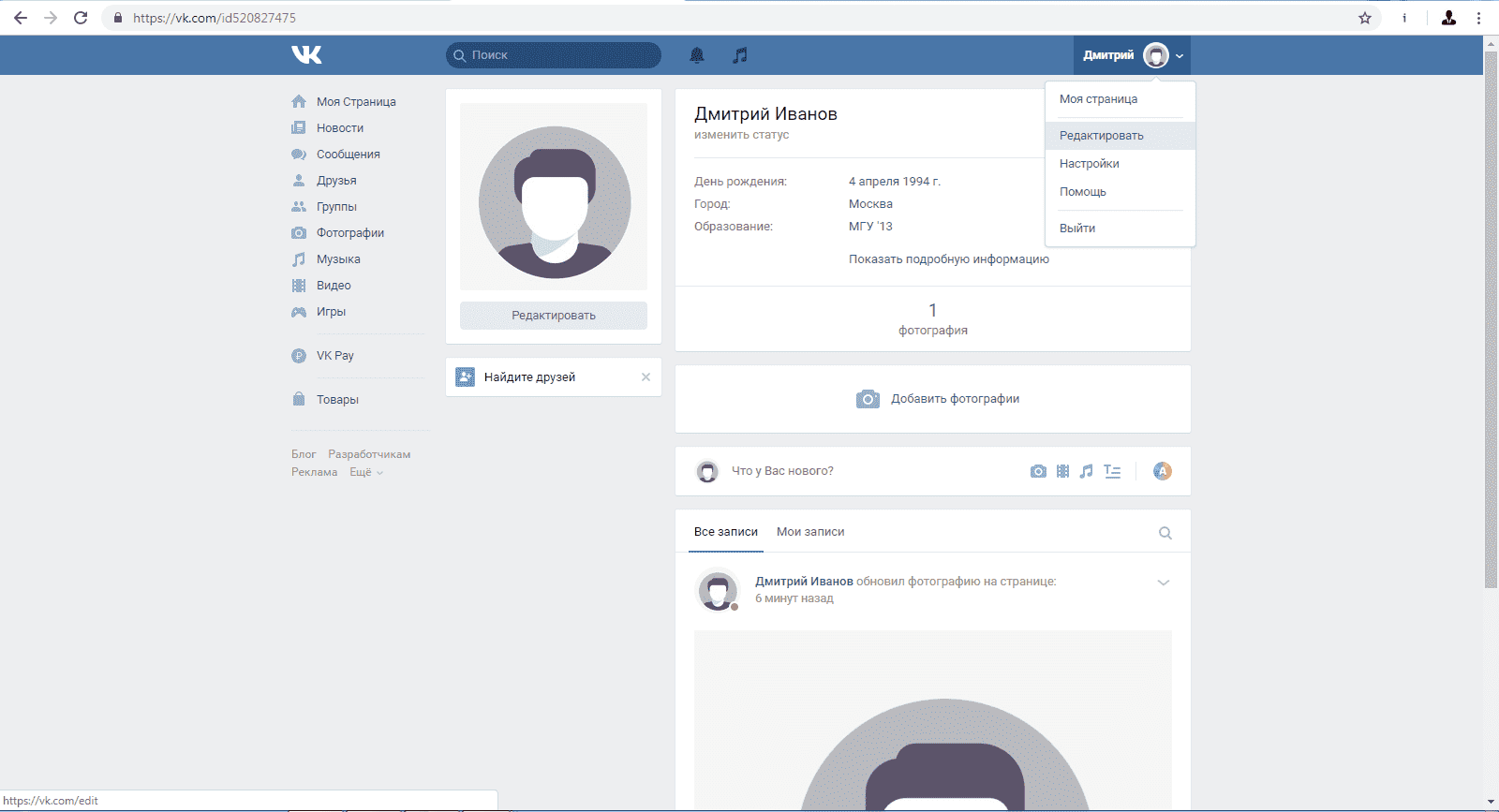 Рис.4 - Пустой профиль социальной сети “ВКонтакте”, по которому можно найти персональные данные без использования фото