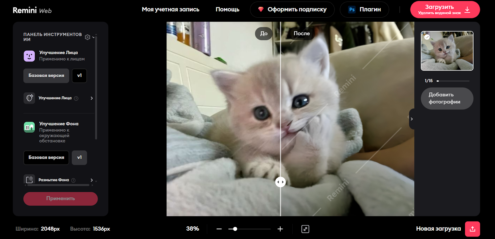 Рис. 1 - Интерфейс и пример улучшения качества изображения Remini