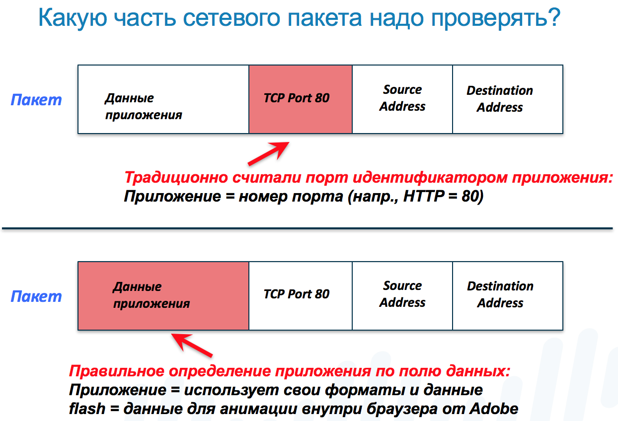 Требования. Ваш новый межсетевой экран должен проверять тип трафика по реальному контенту который передается внутри пакетов. Мир изменился: даже на входе в театр сейчас стоят рамки металлоискателей: показать свой номер ряда и кресла уже недостаточно. То же самое и в корпоративных сетях: нужно проверять содержимое сетевых пакетов, а не их заголовки. Ваш новый межсетевой экран должен уметь определять приложения по содержимому поля данных, причем на любых портах.
