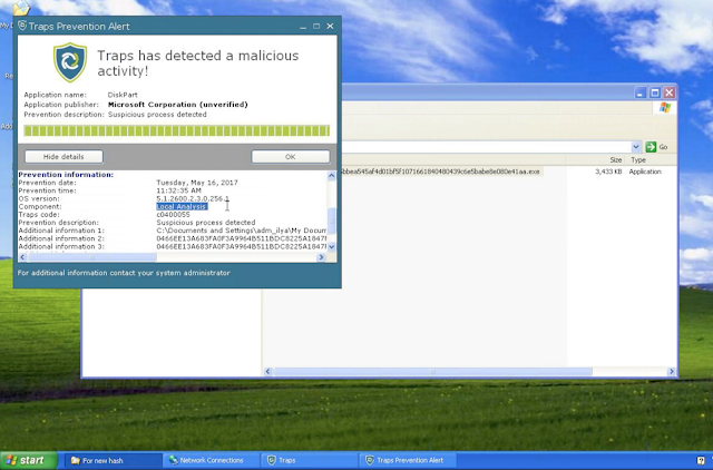 Вот так выглядит скриншот TRAPS после запуска exe файла с WanaCrypt0r.