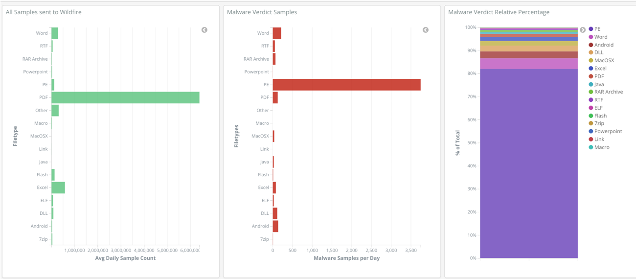 Следующая статистика собрана уже по типам файлов. Видно, что большинство файлов, которые идут на проверку - это PDF, однако большинство типов файлов, которые содержат вредоносный код - это EXE. Совершенно не значит, что нужно защищаться только от EXE, ведь вам может хватить одного вредоносного файла для MacOS, чтобы потерять все данные.
