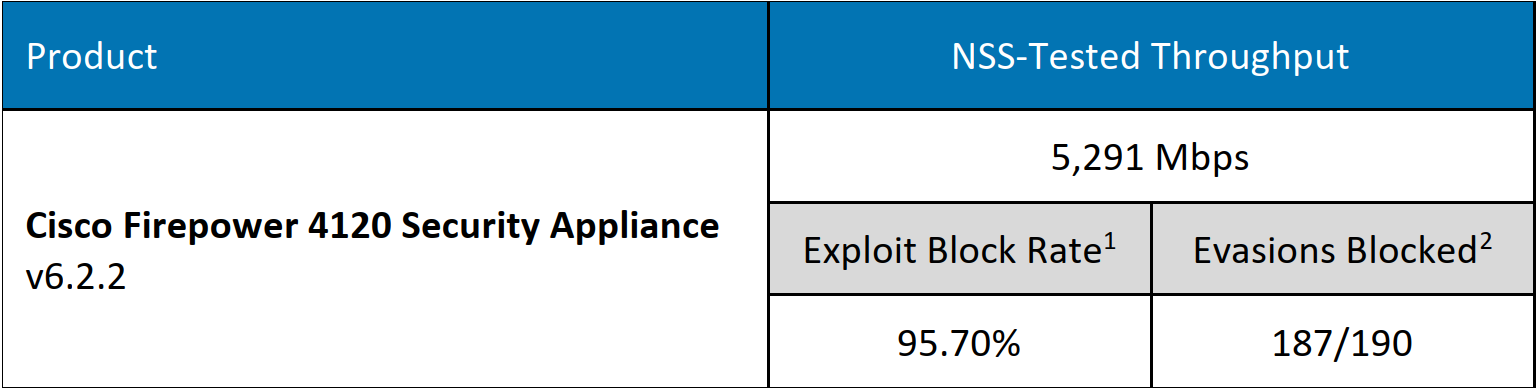 В интернет можно найти отчет NSS для Palo Alto Networks PA-5220 и для Cisco FTD 4120. То есть устройство 4120, которое еще более быстрое чем 4110. По данным Cisco модель 4120 на 50% быстрее чем 4110: вендор сделал сравнение их скорости в своей лаборатории (заметьте на одинаковом трафике и в одинаковом режиме): 15 Гбит/с для 4120 и 10 Гбит/с для 4110.